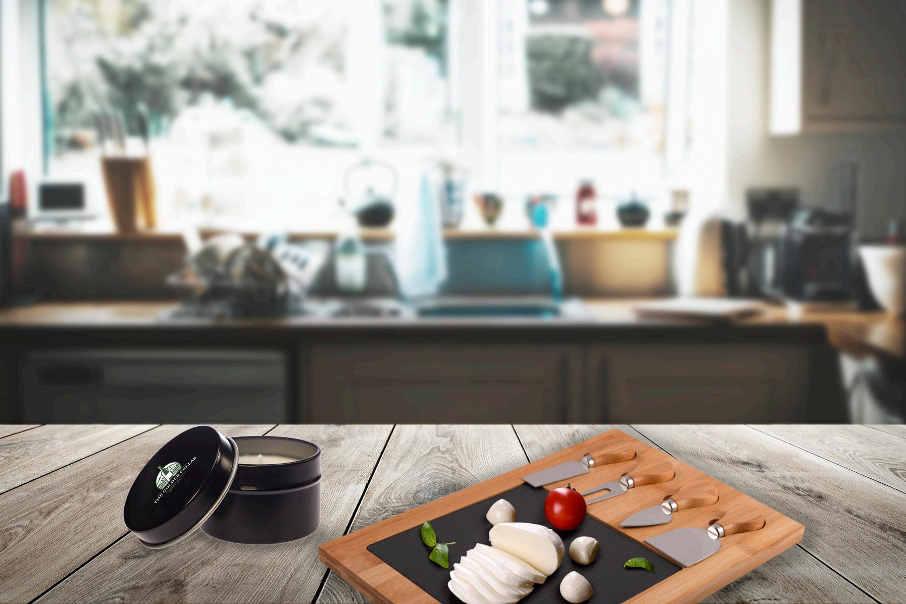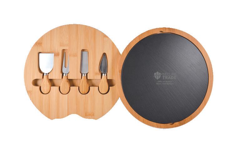 Cheese board set featuring bamboo board with slide-opening lid, removable slate insert, and four bamboo/stainless steel knives.