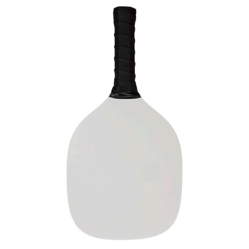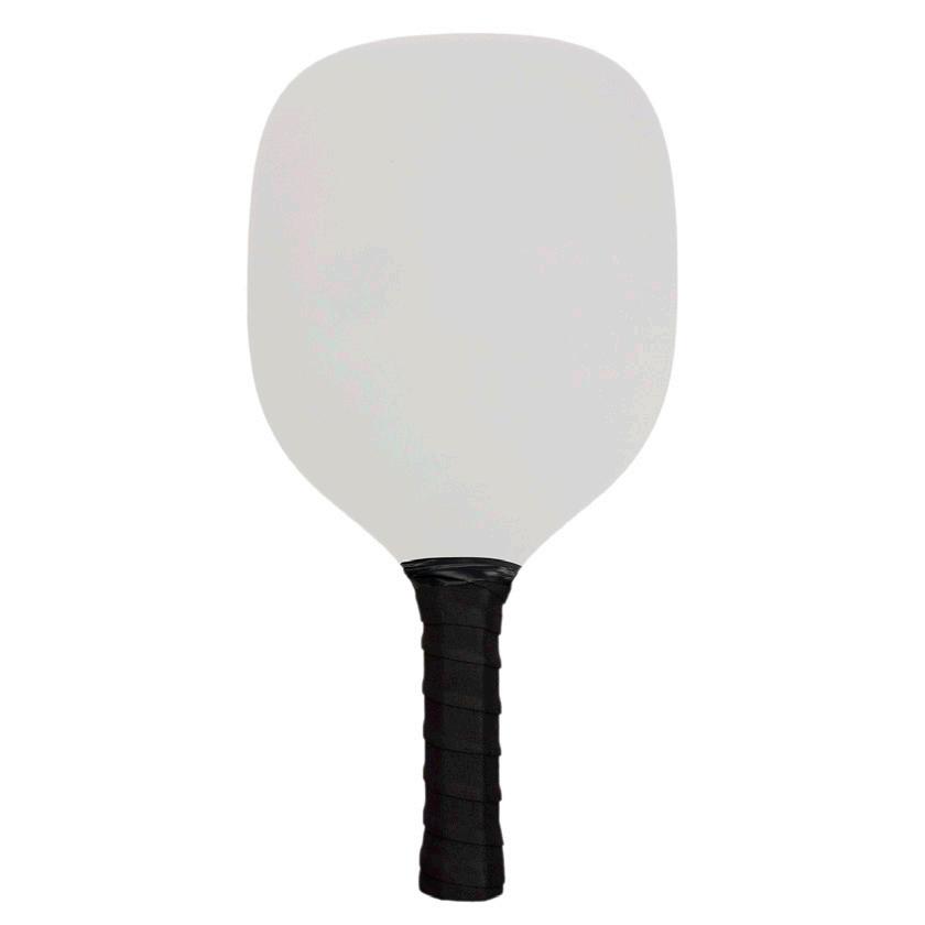 Pickle ball set with 2 MDF bats, 1 white ball, and natural poly-cotton drawstring pouch. White bats with black handles. Bat Size: 190mmL x 380mmH