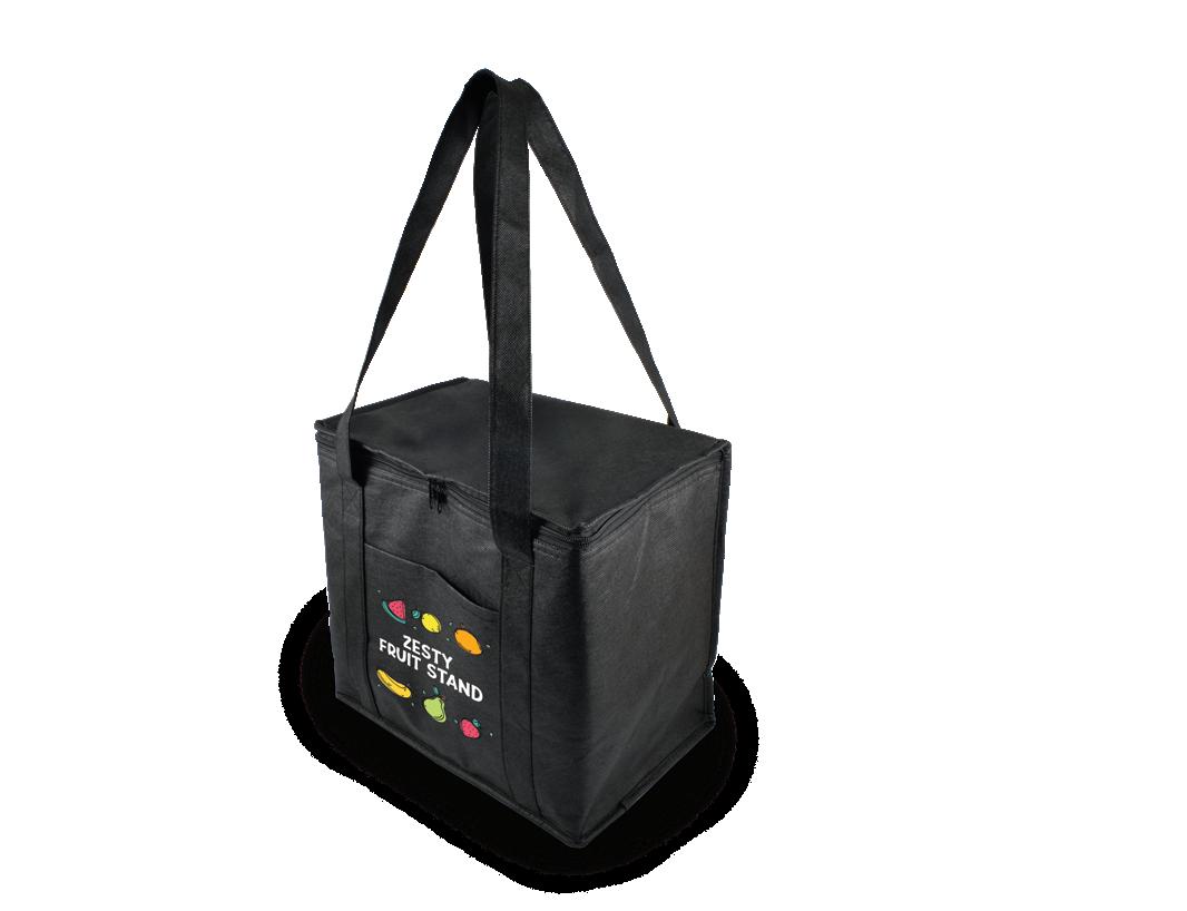 20L cooler shopping bag, made from 80gsm non-woven material with aluminium foil-lined insulation. It features a zippered top closure with 2 zips, double handles, and a large slip pocket on the front.