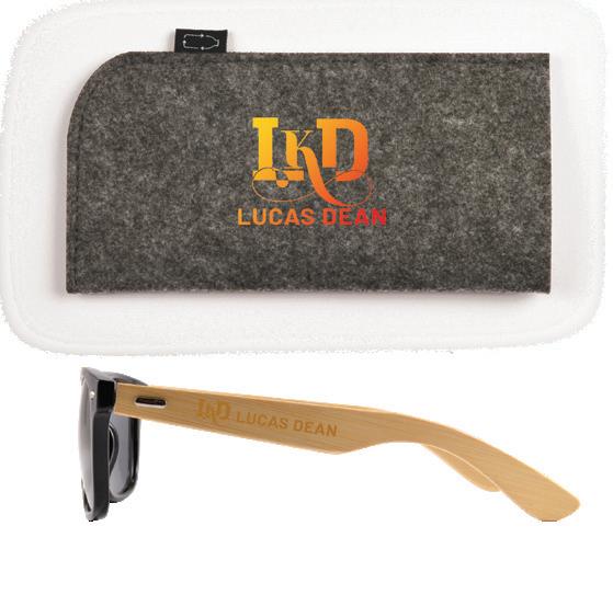 Grey RPET felt sunglasses pouch and Bamboo/Black sunglasses with tinted lenses. Item Size: 180mmL x 90mmW x 4mmH