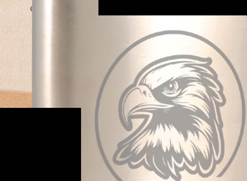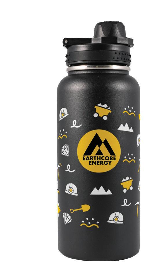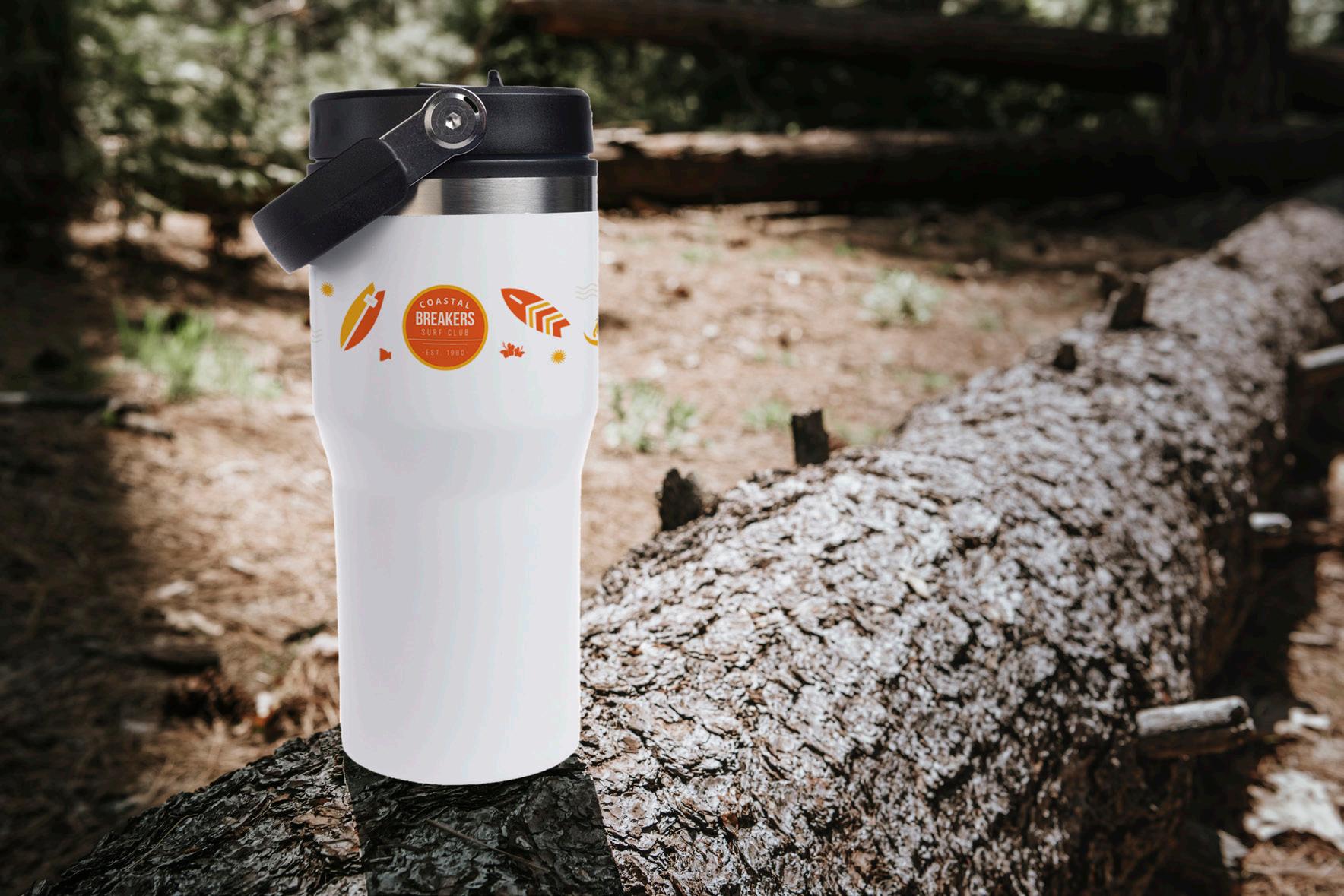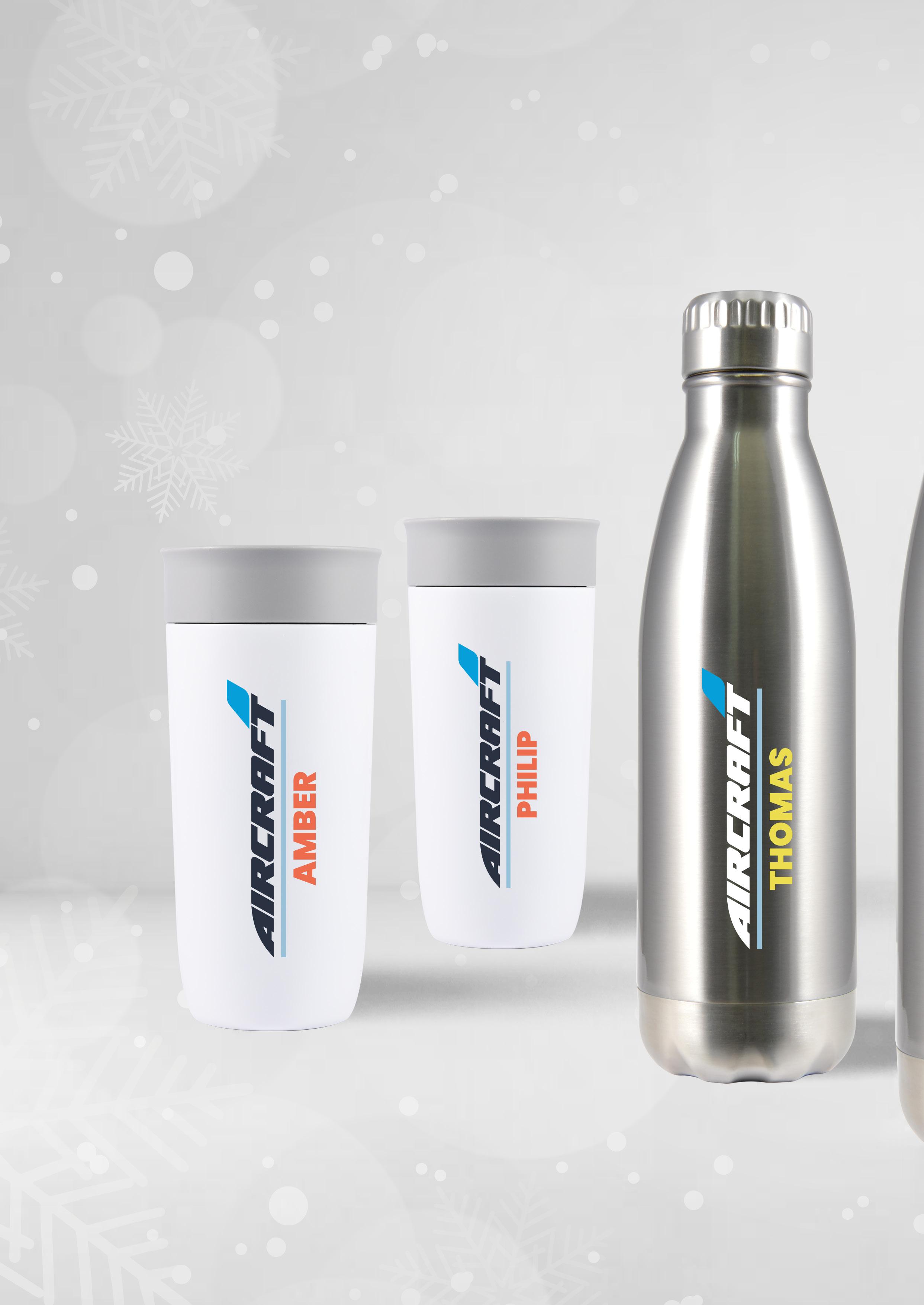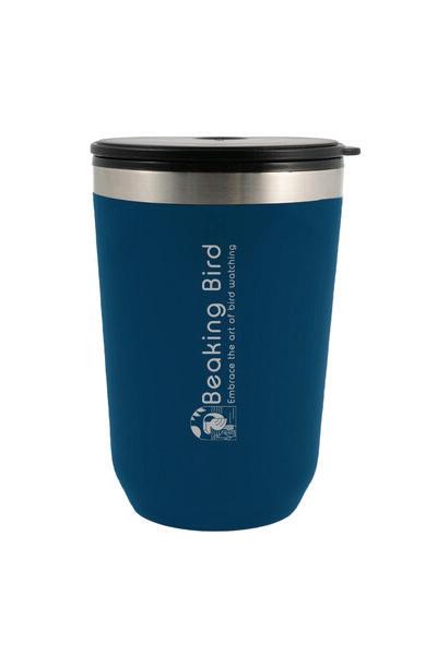 A stainless steel cup with a black recycled PP liner, secure screw-on lid, and flip-up drinking piece. BPA-free, it comes in a kraft gift box.