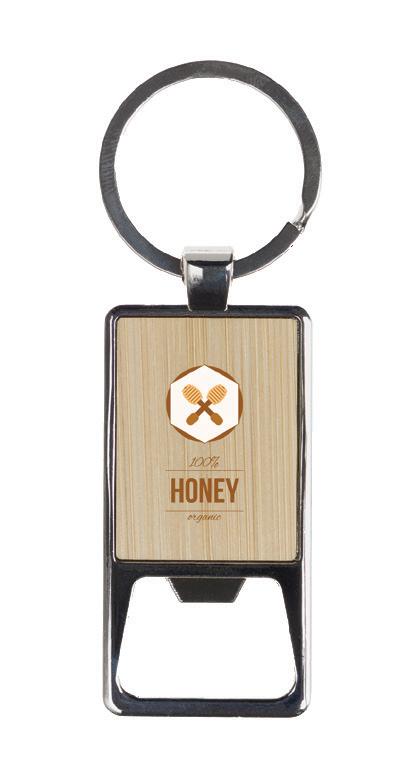 A sleek keyring and bottle opener with a shiny cast zinc finish and bamboo veneer insert for a premium touch.