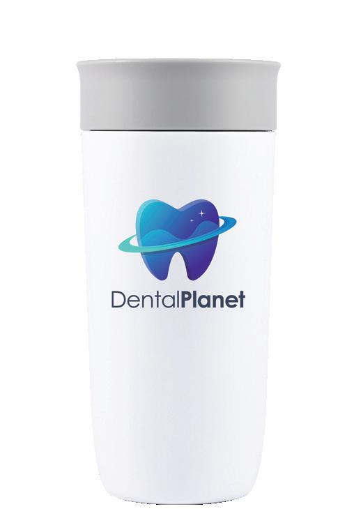 Modern curved double-wall vacuum stainless steel cup with a sliding splash proof lid. Suitable for both hot and cold beverages.