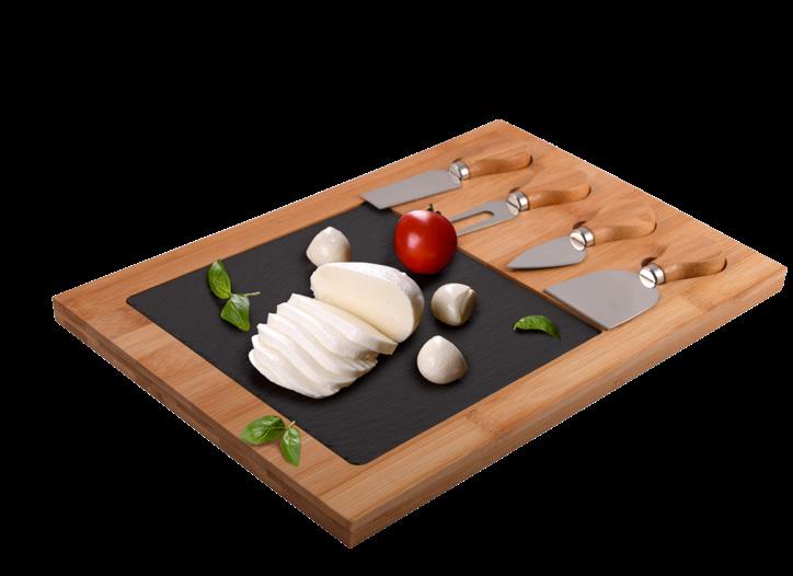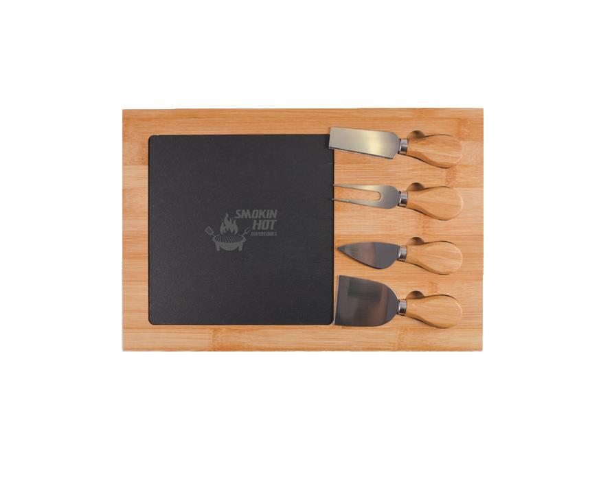 Bamboo cheese board set with removable slate insert and four bamboo/stainless steel knives.
