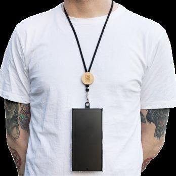 Black cord phone lanyard with bamboo slide adjuster and RPET phone attachment. Fits most phones with a case. Wear over shoulder or neck.