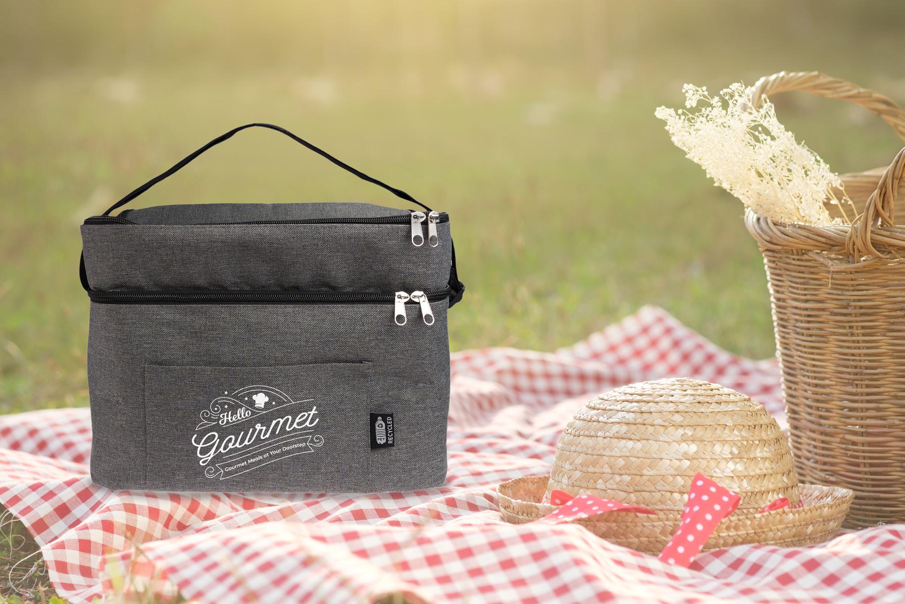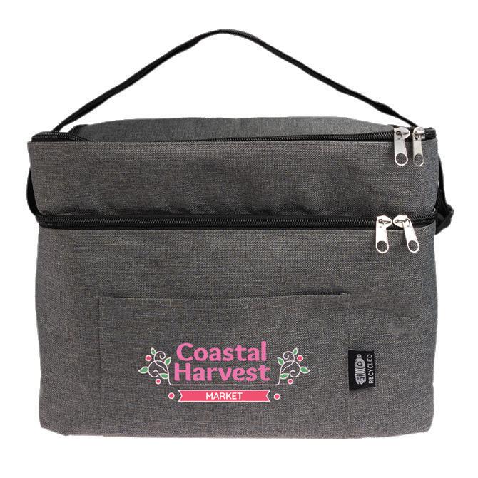 Large 14L cooler bag with two compartments, made from grey RPET polyester. Includes front pocket, adjustable strap, black zipper closure, and features RPET tag.