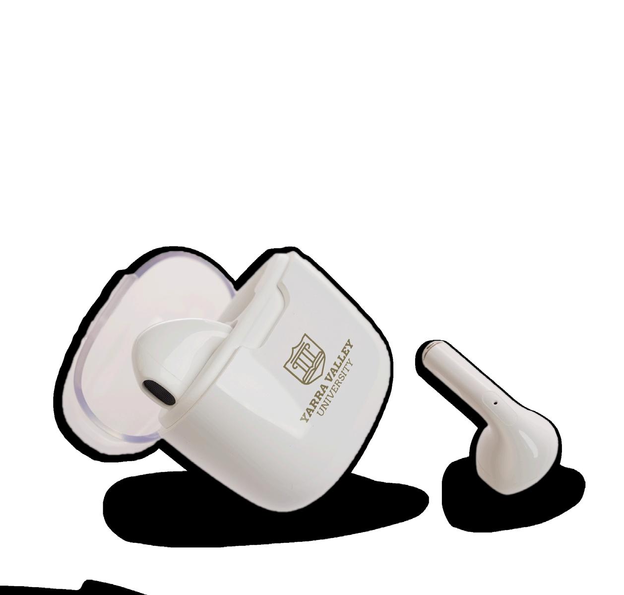 White bluetooth TWS stick ear buds with touch controls, 3-4 hours playtime, 10m connecting distance. White case base with see-through lid. Includes USB A to Type C cable. Item Size: 46mmL x 21mmW x 46mmH