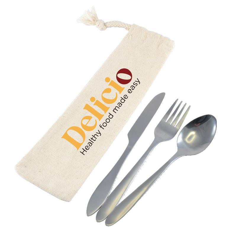 Eco-friendly stainless steel cutlery set in calico pouch. Includes full-size knife, fork, and spoon.