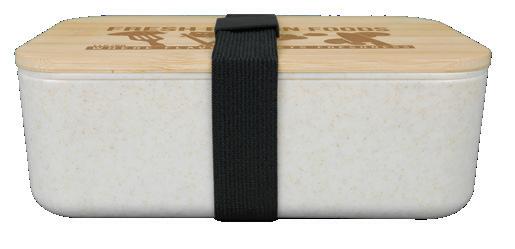 Eco-friendly wheat straw lunch box with bamboo lid and utensils. Includes black elastic strap. Supplied in a Kraft sleeve. Item Size: 193mmL x 114mmW x 68mmH