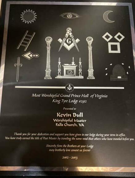 There is no greater accolade then being recognized by a group of your peers who recognize your commitments and contributions to the fraternity as well as the community. I feel very lucky to have been able to contribute to the community over the years and look forward to many more years of service. Thank you for bestowing this great honor upon me. This is by far one of the most memorable moments during my membership with King Tyre #292 MWPHL of VA and Evening Star #228 MWPHL of VA Affiliate.