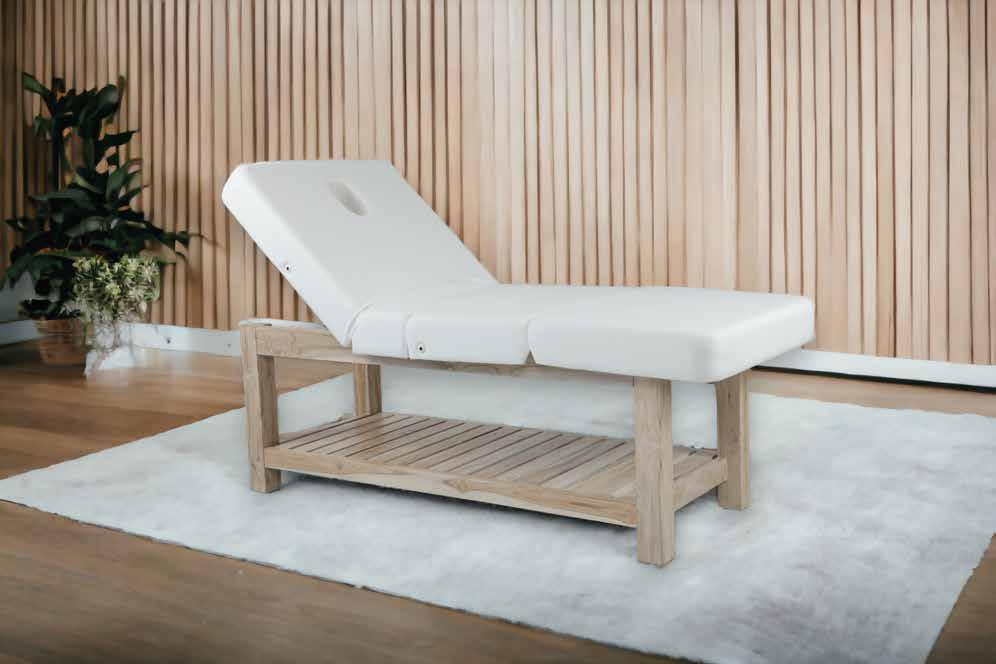 Il comodo materasso, dotato di foro facciale, permette al cliente di rilassarsi completamente durante il trattamento, mantenendo una posizione comoda e anatomica. Inoltre, il basamento in legno di alta qualità offre una stabilità eccezionale, con scomparti appositamente progettati per l'alloggio di macchinari, towel e tutto il materiale necessario durante i trattamenti, garantendo un'organizzazione impeccabile e un flusso di lavoro efficiente.