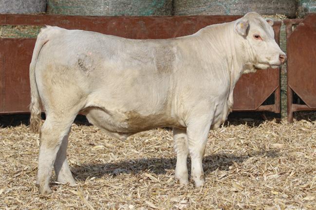 — Big topped with lots of length of body, this is a bull who gained 4.1 on test and has a big YW of 1,379 lbs. He is out of a first calf heifer sired by Keys Maximizer 5H and goes back to a long string females stemming from the Nancy cow family in the Charolais breed. He is above average in the breed for CED, BW, YW and Milk.
