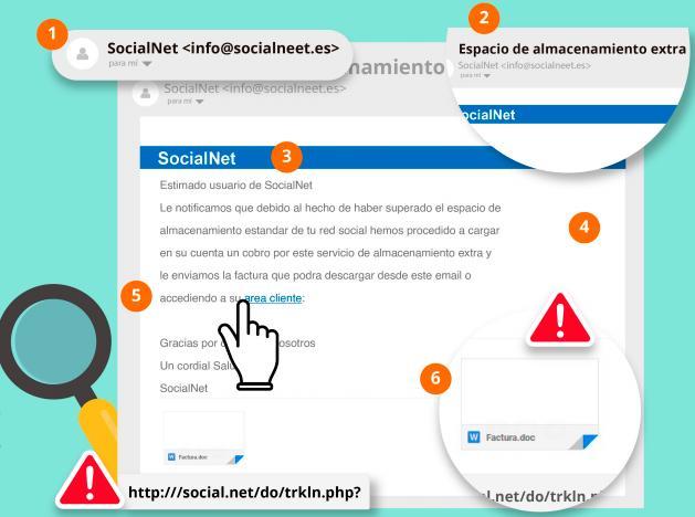 • Enlacesextraños: Pasa el cursor sobre los enlaces sin hacer clic para ver la URL real (¡casi nunca es la que esperas!).