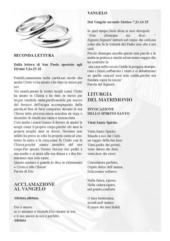 LITURGIA DEL MATRIMONIO INVOCAZIONE DELLO SPIRITO SANTO Vieni Santo Spirito Vieni,Santo Spirito, Manda a noi dal Cielo un raggio della tua luce. Vieni,padre dei poveri, vieni datore dei doni, vieni,luce dei cuori. Consolatore perfetto, Ospite dolce dell’anima, Dolcissimo sollievo. Nella fatica, riposo, Nella calura,riparo, nel pianto,conforto O luce beatissima, invadi nell’intimo il cuore dei tuoi fedeli.