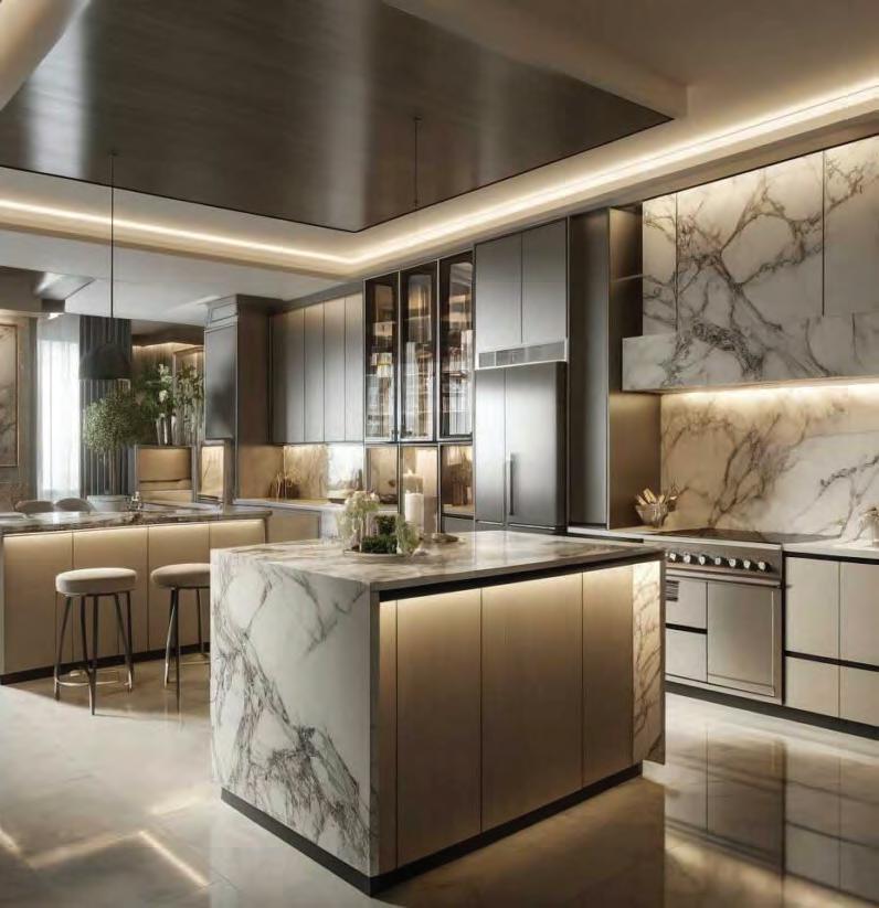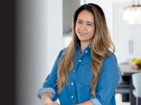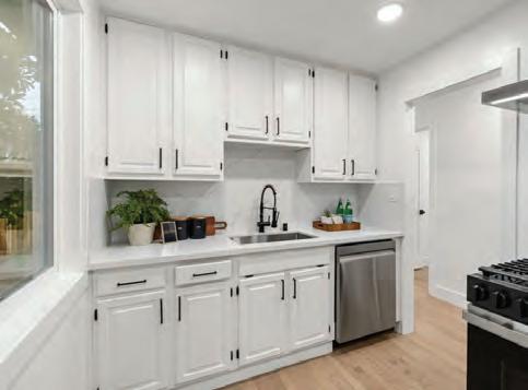 The residence features a private entrance, open living and dining areas with 9’ ceilings, contemporary white and custom lighting, and double-pane Andersen windows and doors. The expansive chef’s kitchen is appointed with professional-grade stainless steel appliances, quality cabinetry, and quartz countertops. Updated bathrooms