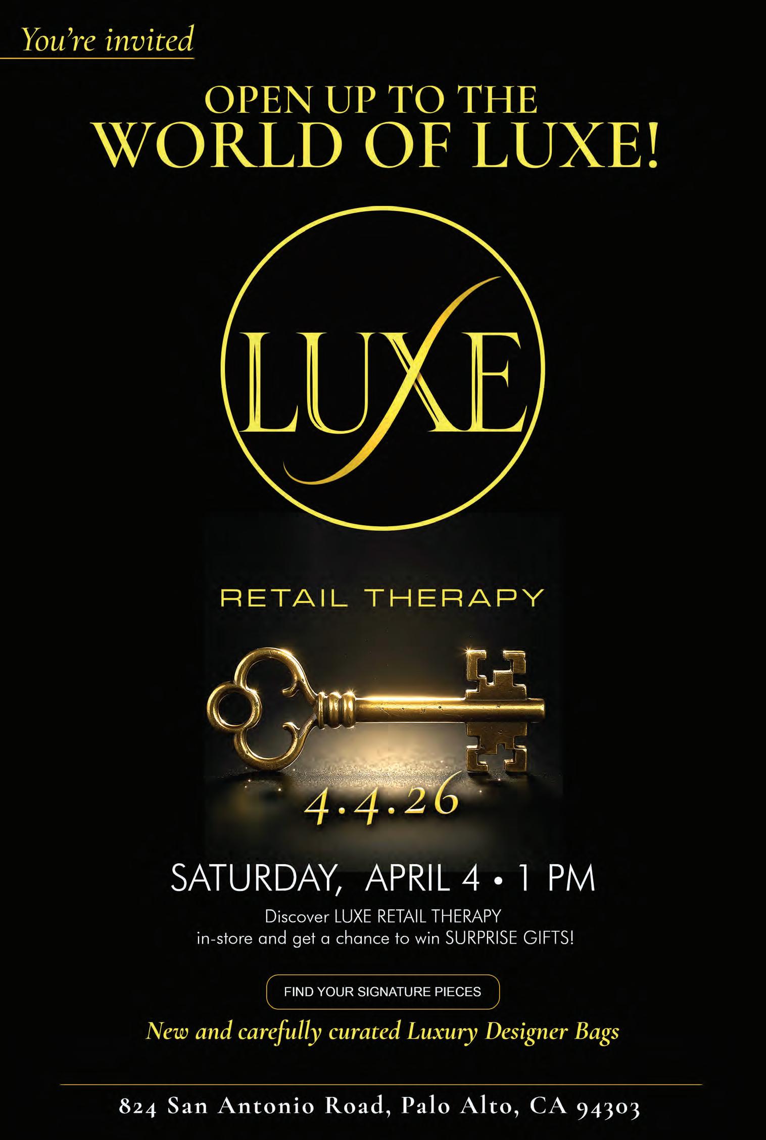INVITES YOU to their grand opening this Saturday, April 4, at 824 San Antonio Road, Palo. Alto. In addition to shopping, LuxeRetail is now accepting luxury and highquality items for consignment. Owner Rachelle Cagampan is committed to sustainability and supporting a circular economy by helping
