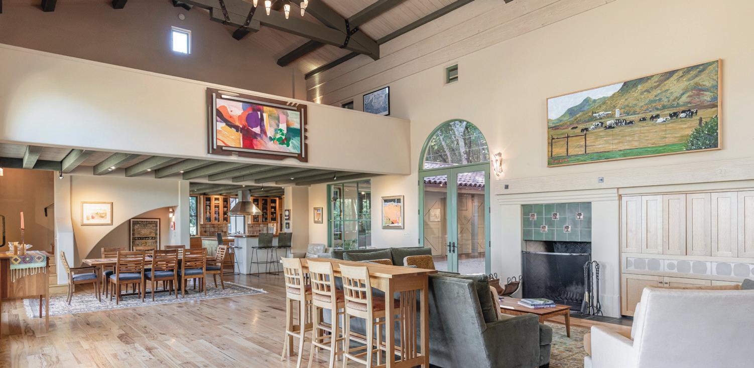 • Towering beamed and paneled ceiling with track lighting and clerestory windows