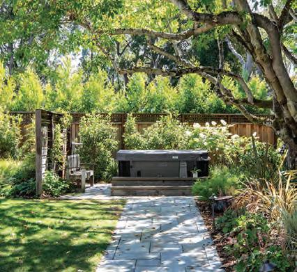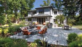 The private rear yard welcomes outdoor living with raised garden beds, Japanese maples, and expansive brick patios that wrap around to one side of the home.