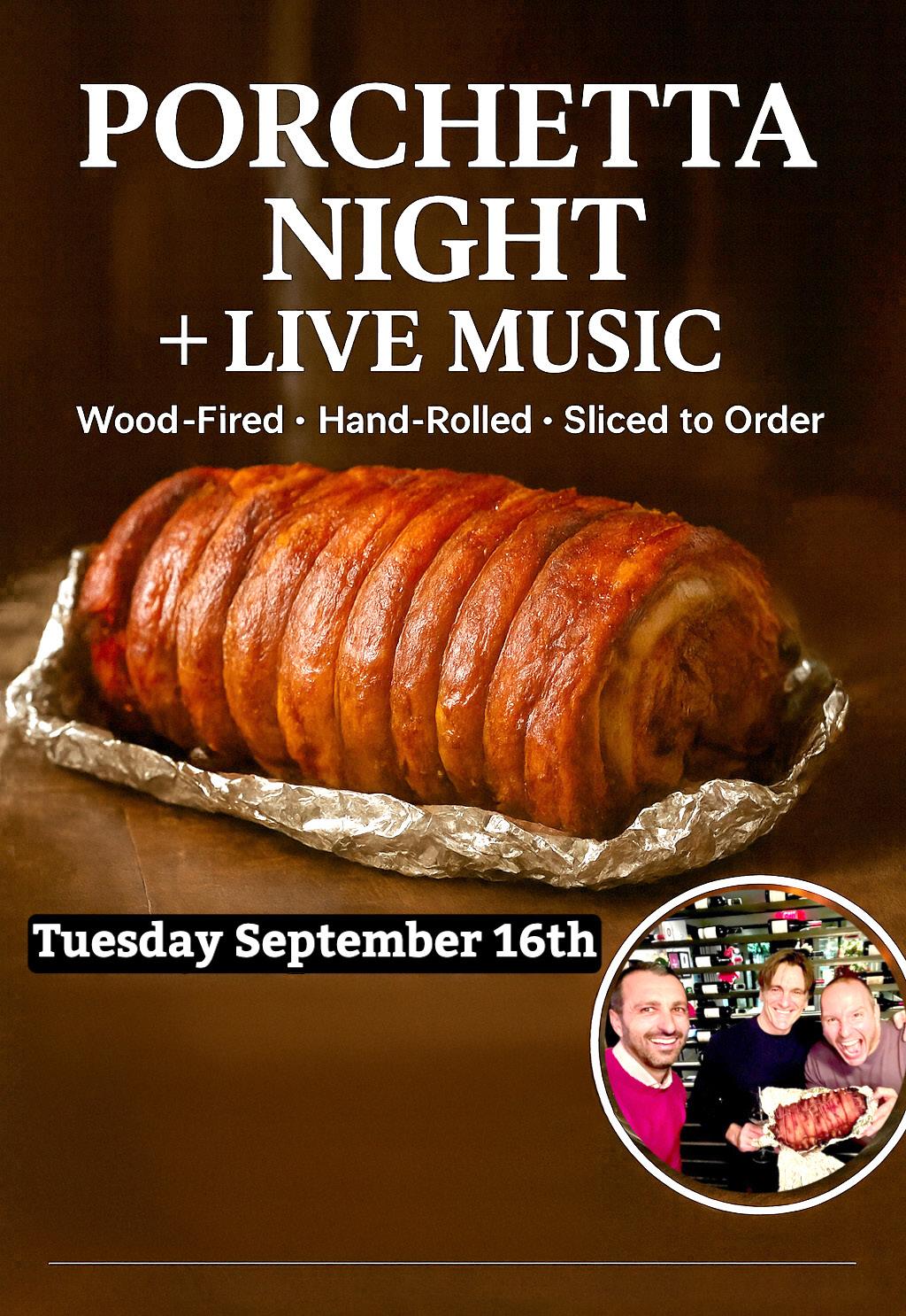 Our last Porchetta Night was a huge success — thank you to everyone who joined us! Due to popular demand, we’re doing it again at Italico. Enjoy our signature slow-roasted porchetta, great wine, and live music starting at 5:30 PM. Book now before it’s too late!
