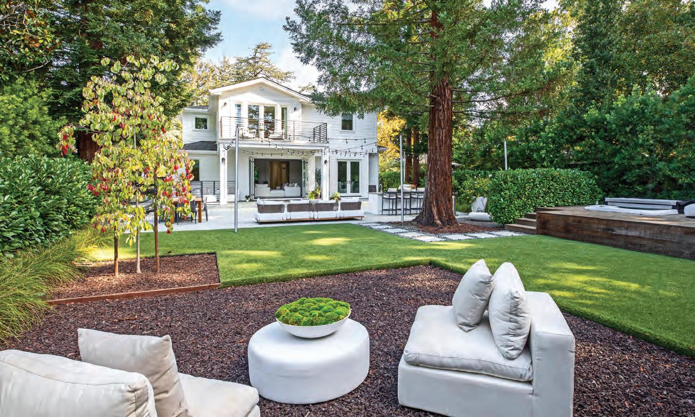• Private rear yard with synthetic lawn, large arbor-covered patio, signature redwood tree, and separately fenced side yard