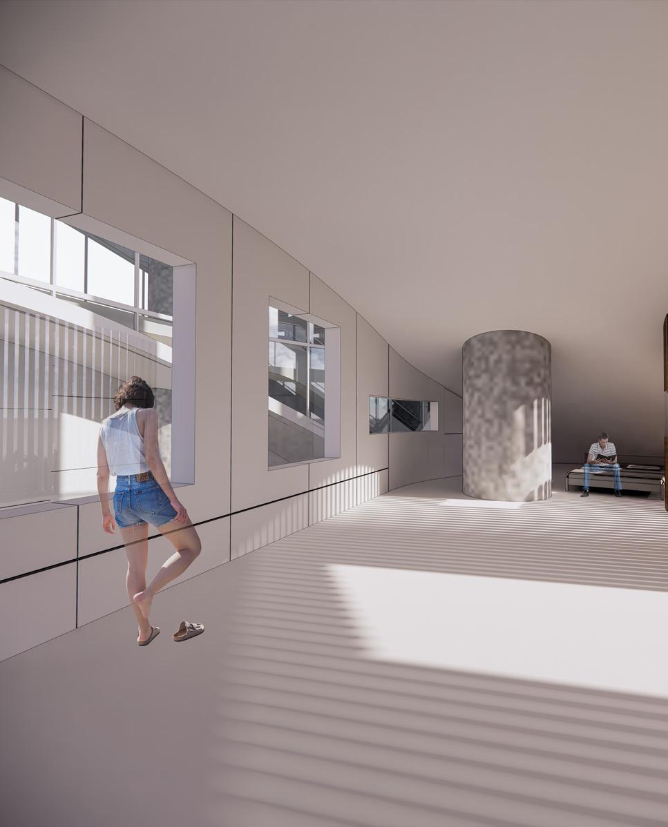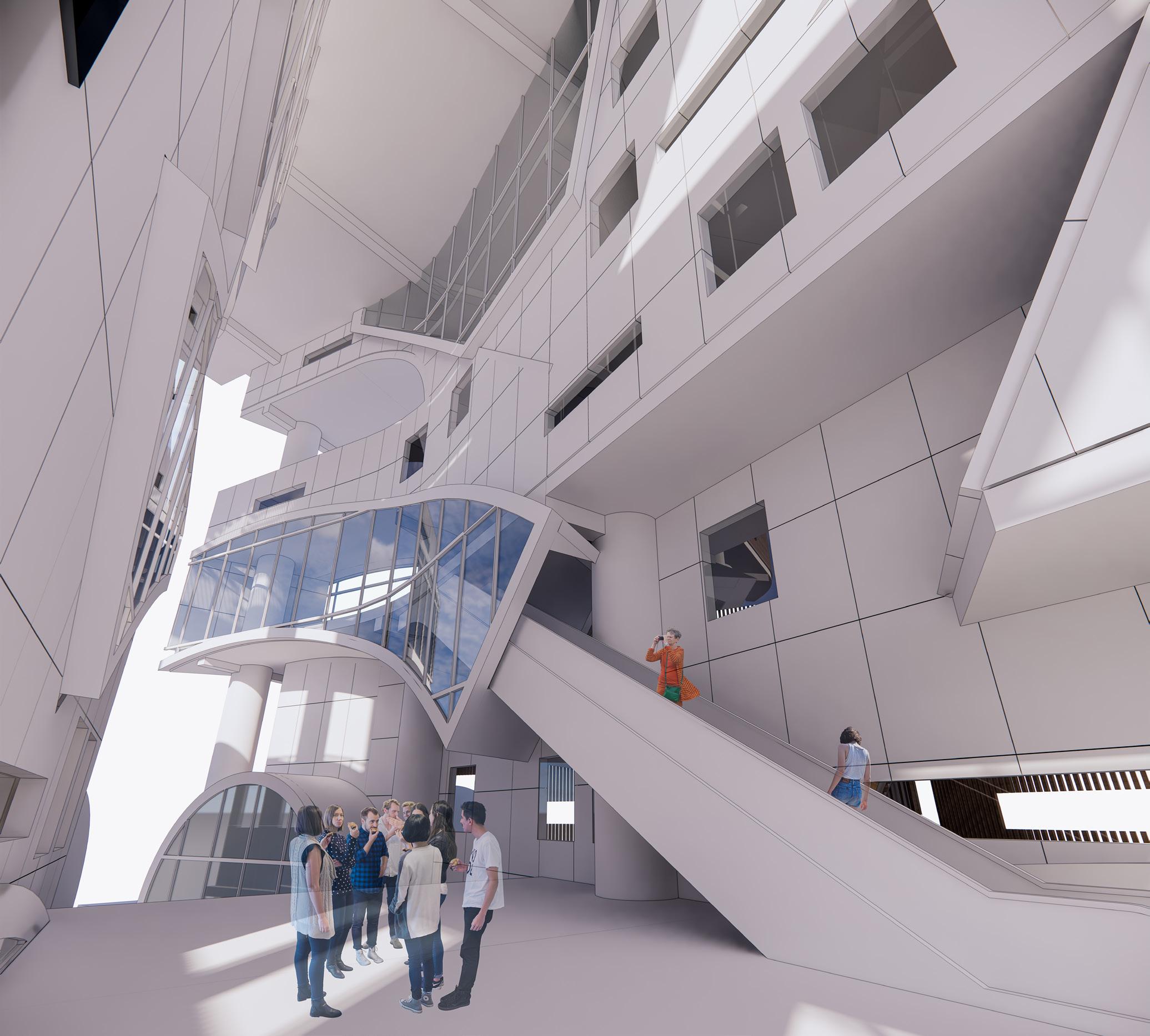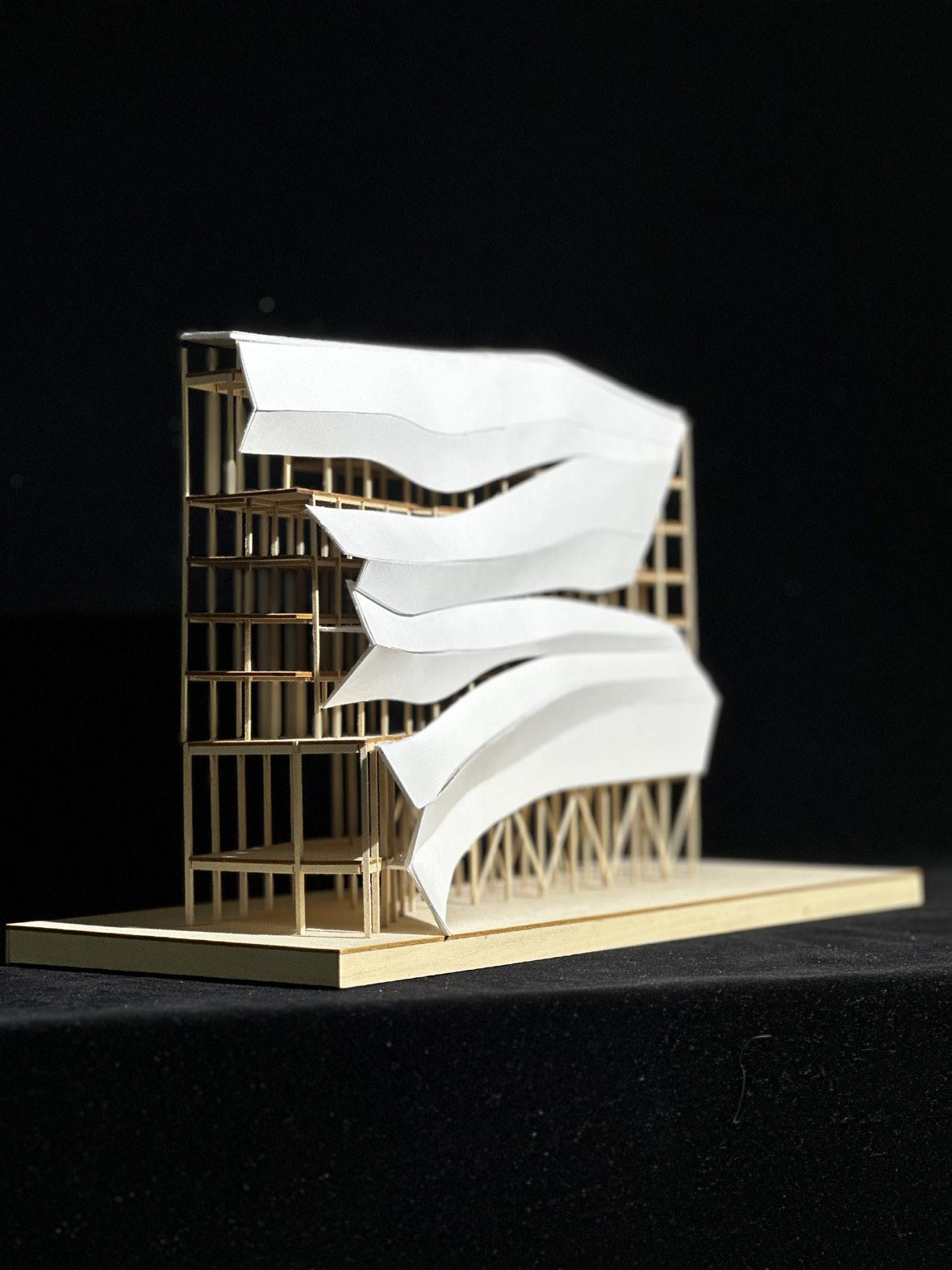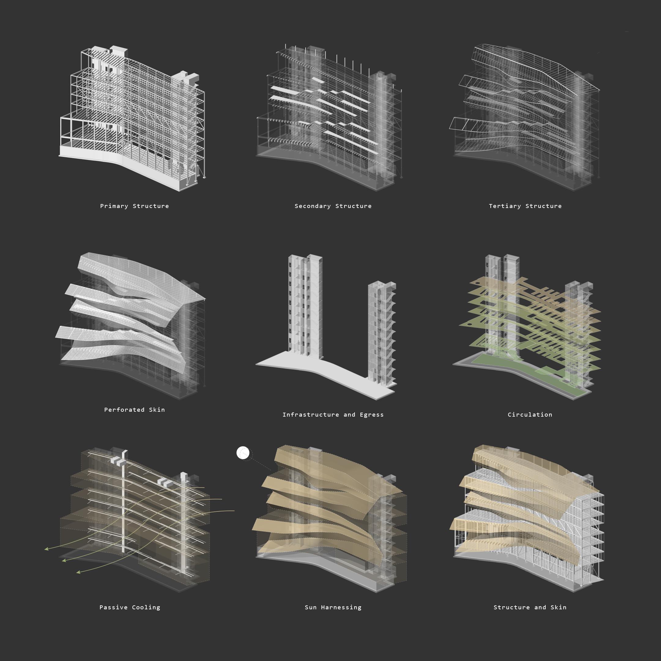 The building’s main feature is its double skin, made of perforated metal. This layer acts as shade for the sun and has solar panel qualities to harness the sun’s energy. It’s detachment from the main building creates in between spaces. Not just balconies, these spaces also provide additional vertical circulation similar to Renzo Piano’s Centre de Pompidou. The form of the skin was admittedly pure intuition. Through the sustainable approach to the master planning, the building was thin and parallel to the street, similar to Morphosis’ SF Federal Building. With the flow of the cars, the speed of the cars, and the master planned form primarily coming from advantageous wind orientation, I thought of one word -- flow. So, I kept drawing the second skin flowy.