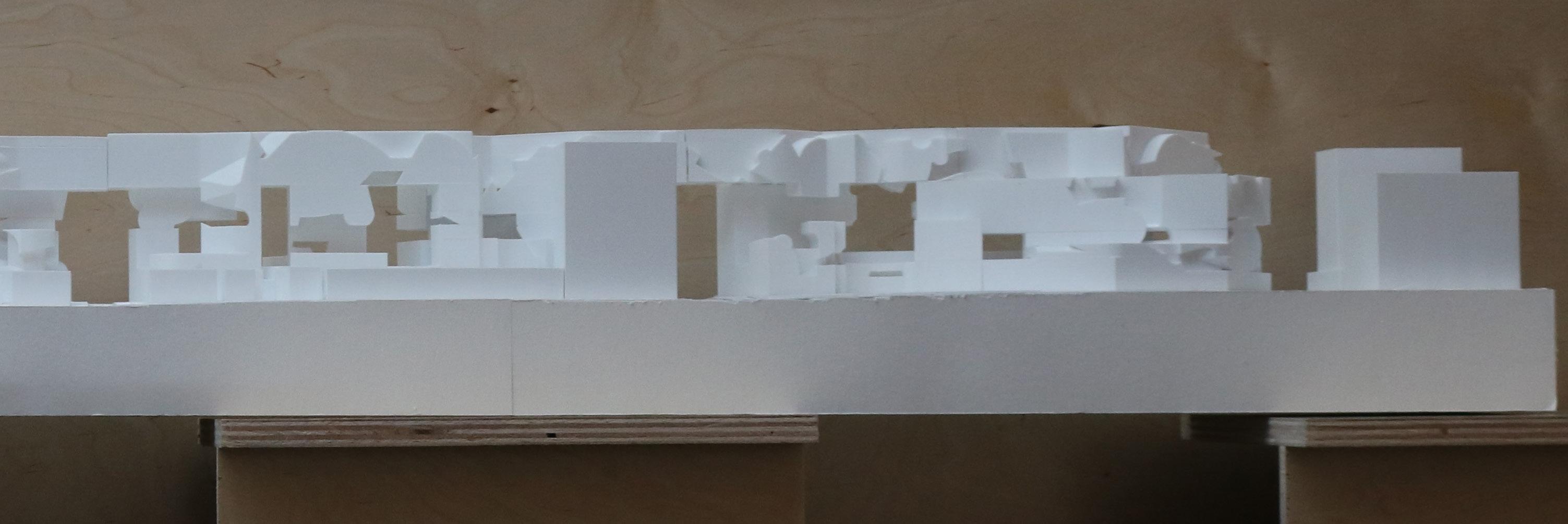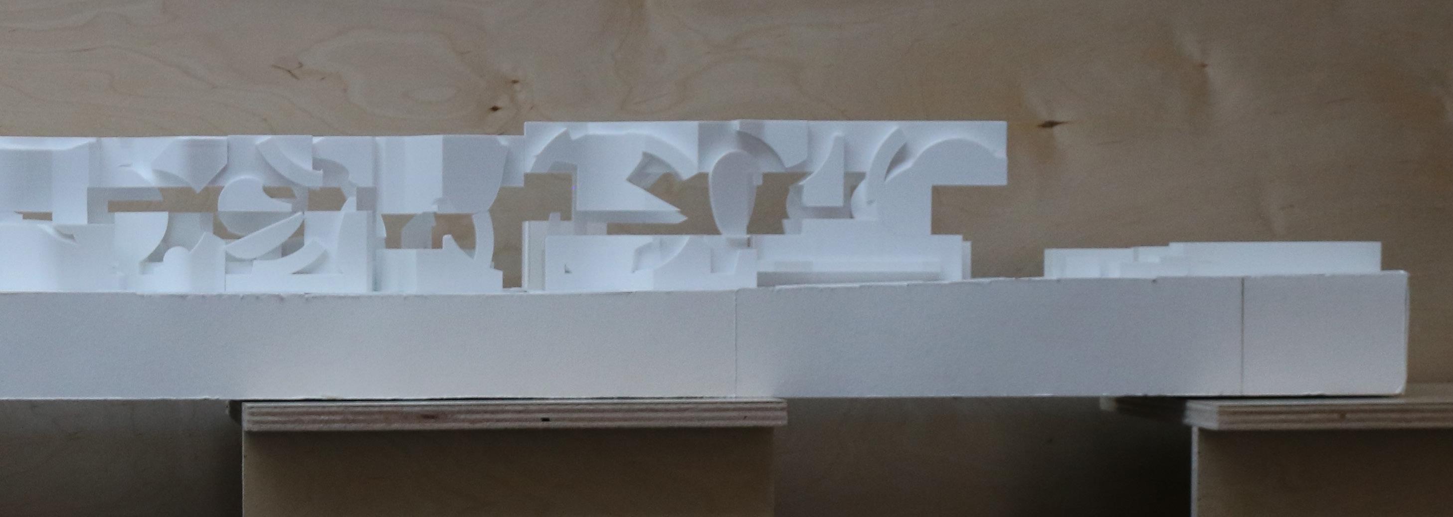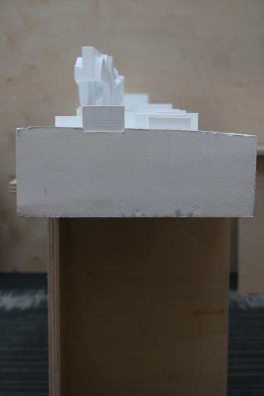 For a moment during the model building process the effort of creating intricate scales to reflect the serendipity of humans became not about the building, but rather, just form. Formally mutations happened before the final model was assembled. I started to see something else with these forms. I did not see buildings, I saw .... animals. Because these forms were placed out of context, they started to take on new shapes. These are the miscellaneous mutations. I rearranged the original 30+ pieces of the model purely off of aesthetics and the anthropomorphic qualities I saw in them. It created a new or perhaps alternative ethos to the project where design can change contexts and somehow can still be relevant.