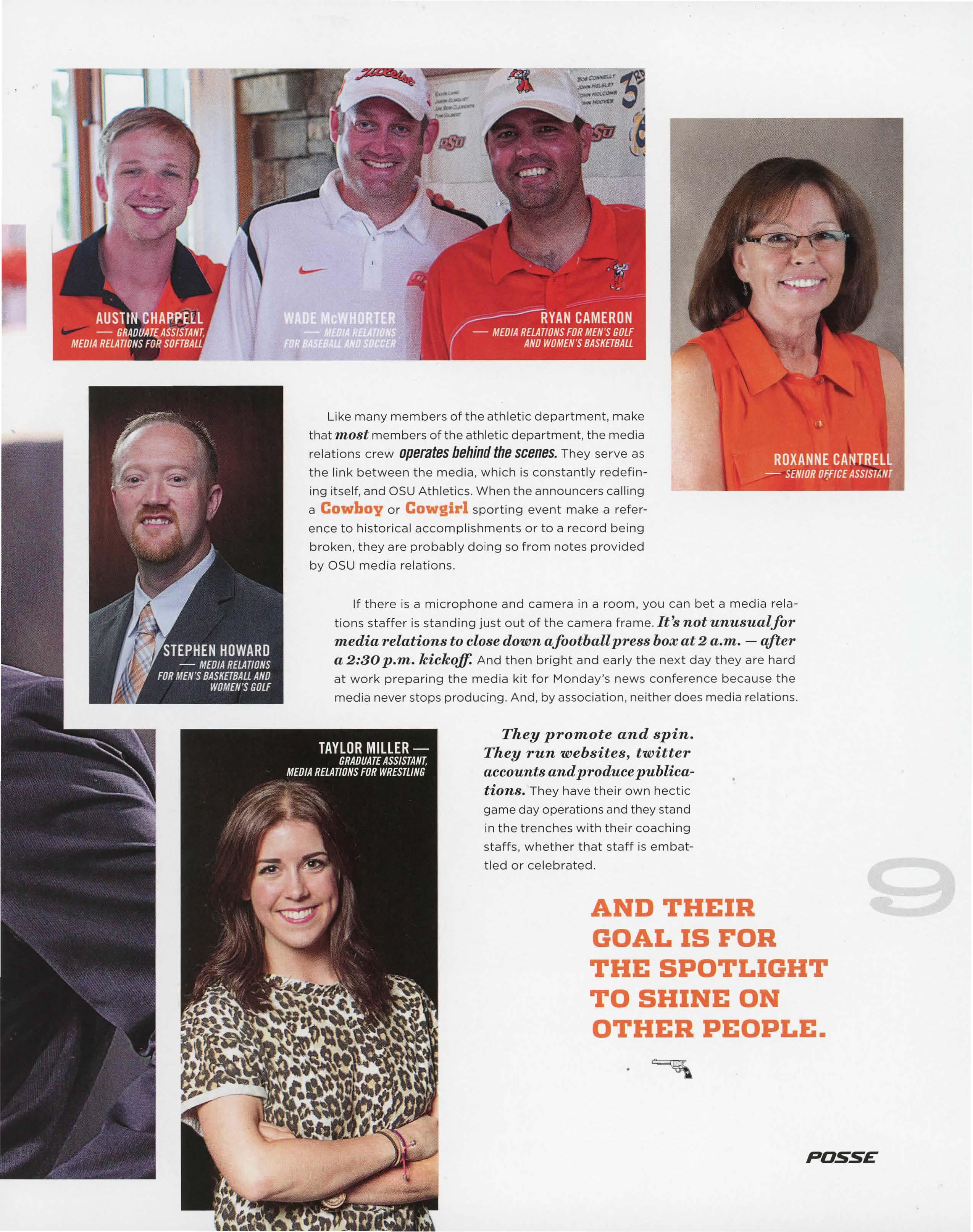 Like many members of the athletic department, make that most members of the athletic department, the media relations crew operates behind the scenes. They serve as the link between the media, which is constantly redefining itself, and OSU Athletics. When the announcers calling a Cowboy or Cowgirl sporting event make a reference to historical accomplishments or to a record being broken, they are probably doing so from notes provided by OSU media relations.
