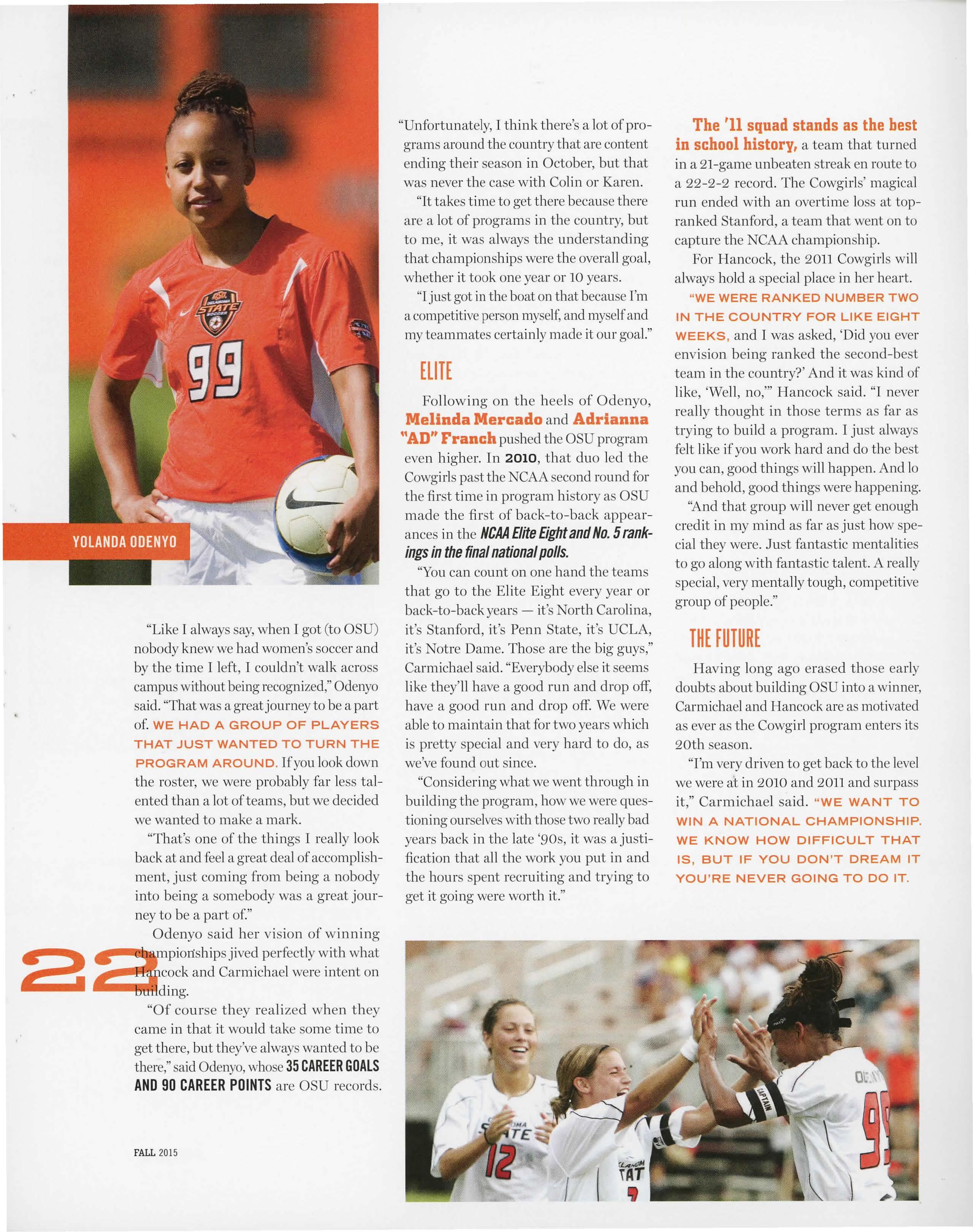 Once settled on the plains of Oklahoma with Hancock as the Cowgirls' head coach and Carmichael her assistant, the duo began the task of building a soccer programfrom the ground up.