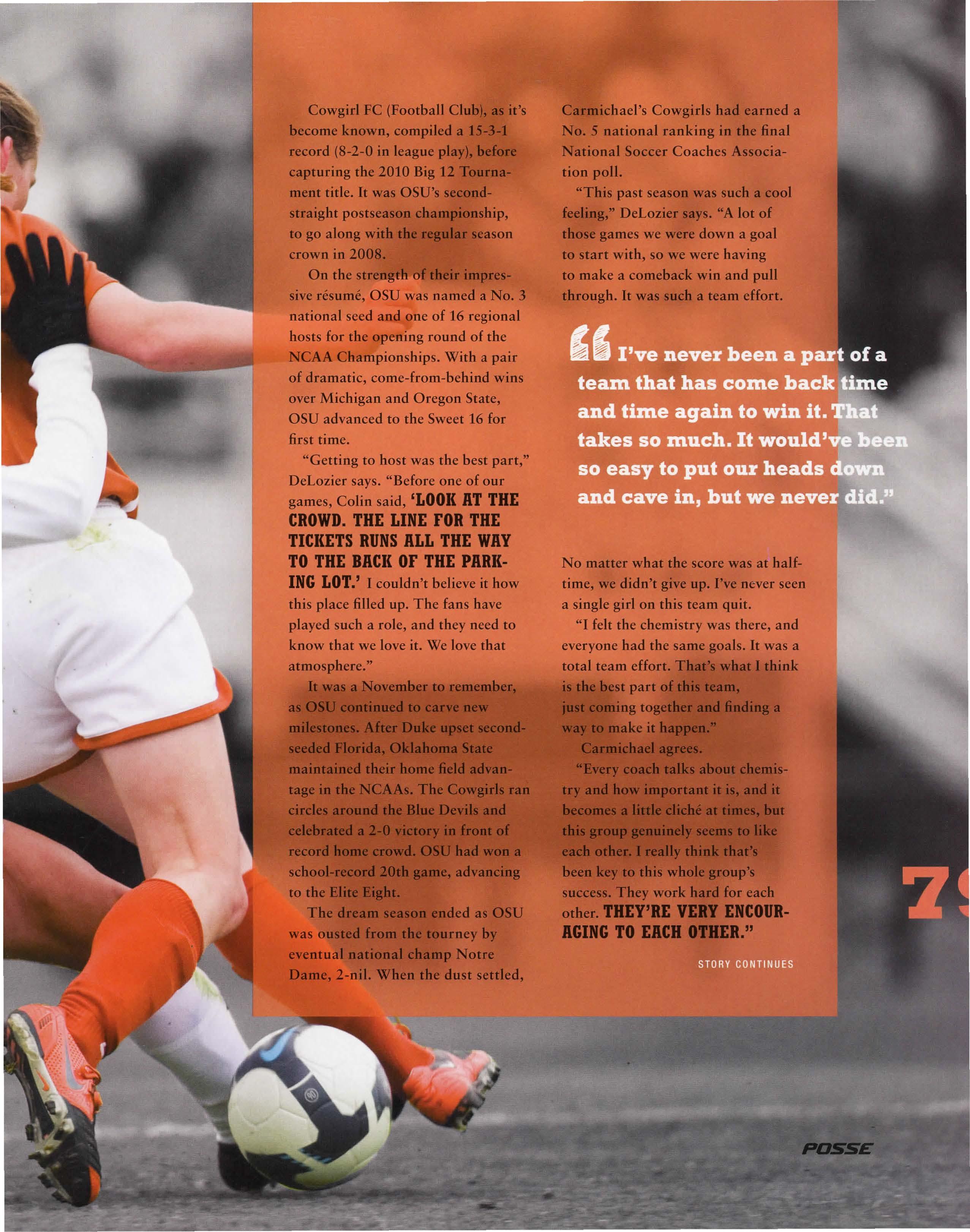 Cowgirl FC (Football Club), as it's become known, compiled a 15-3-1 record (8-2-0 in league play), before capturing the 2010 Big 12 Tournament title. It was OSU's secondstraight postseason championship, to go along with the~ season crown in 2008.
