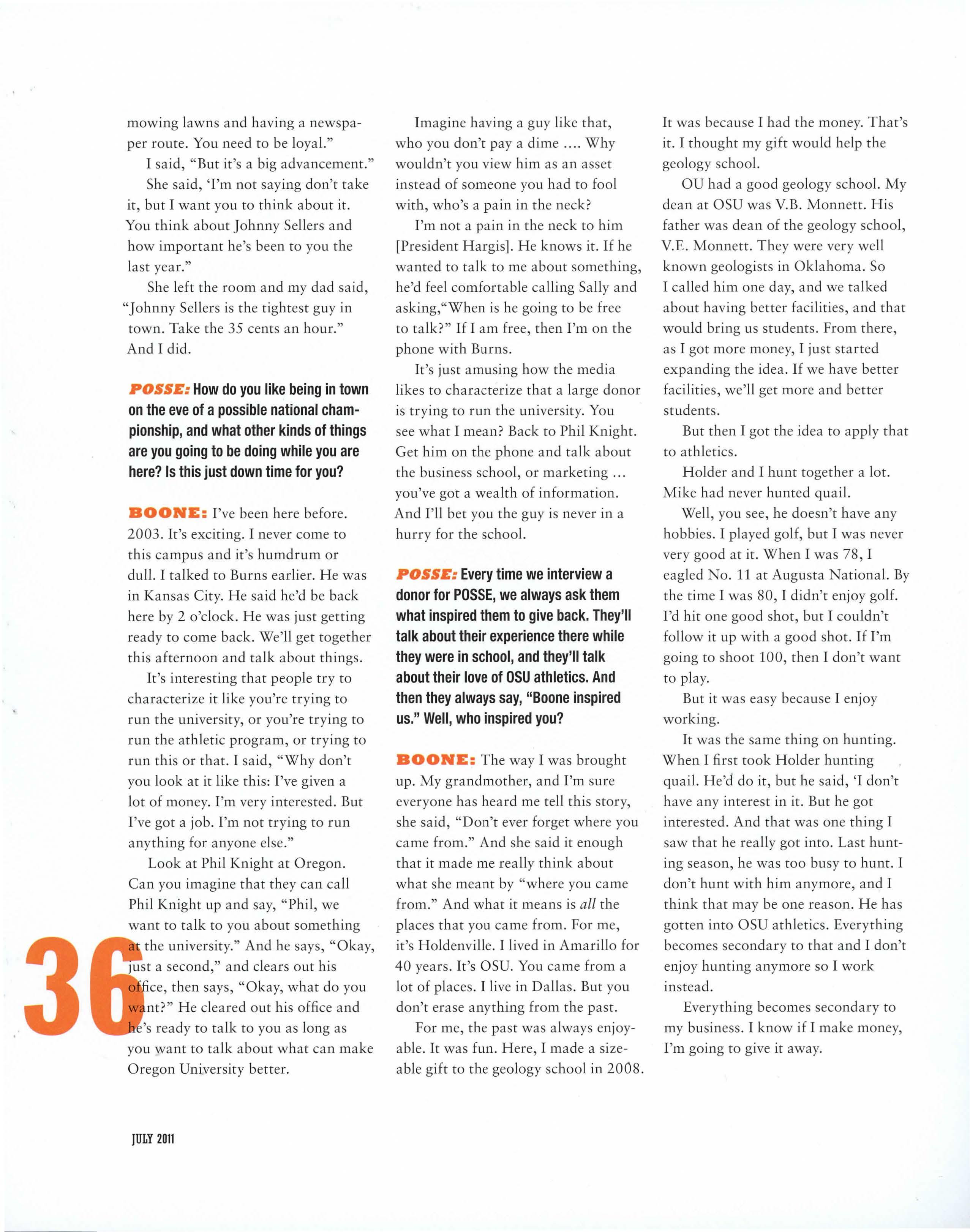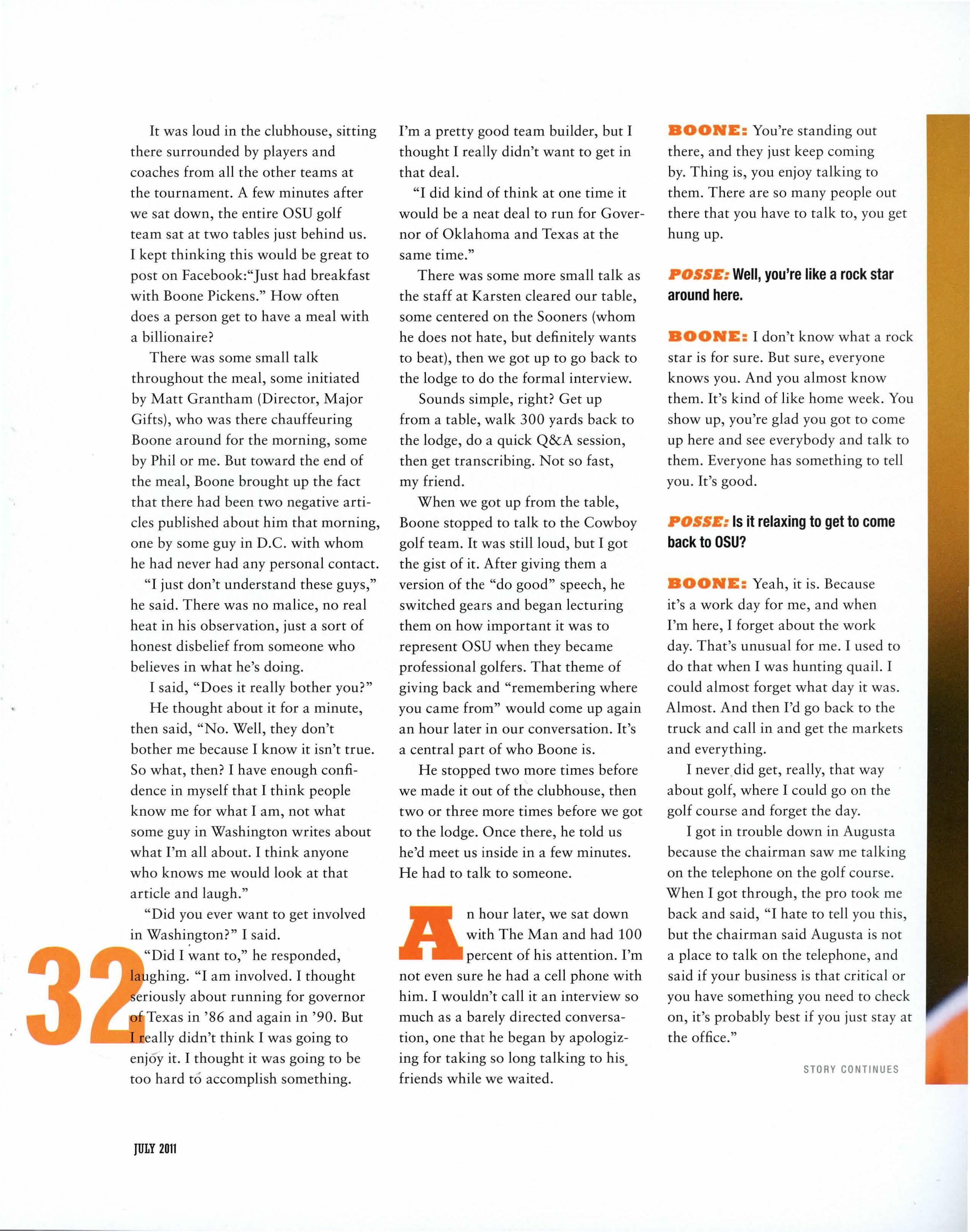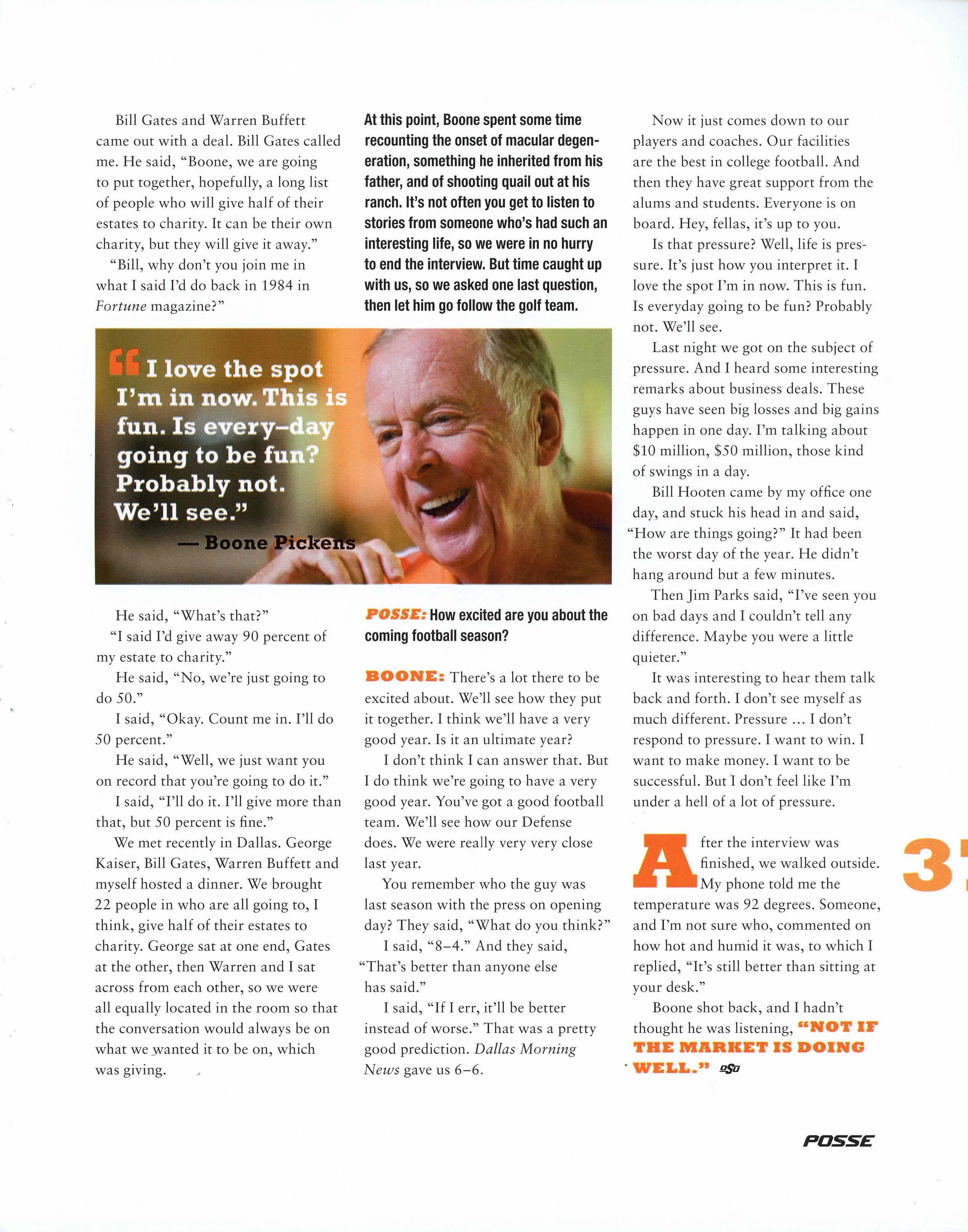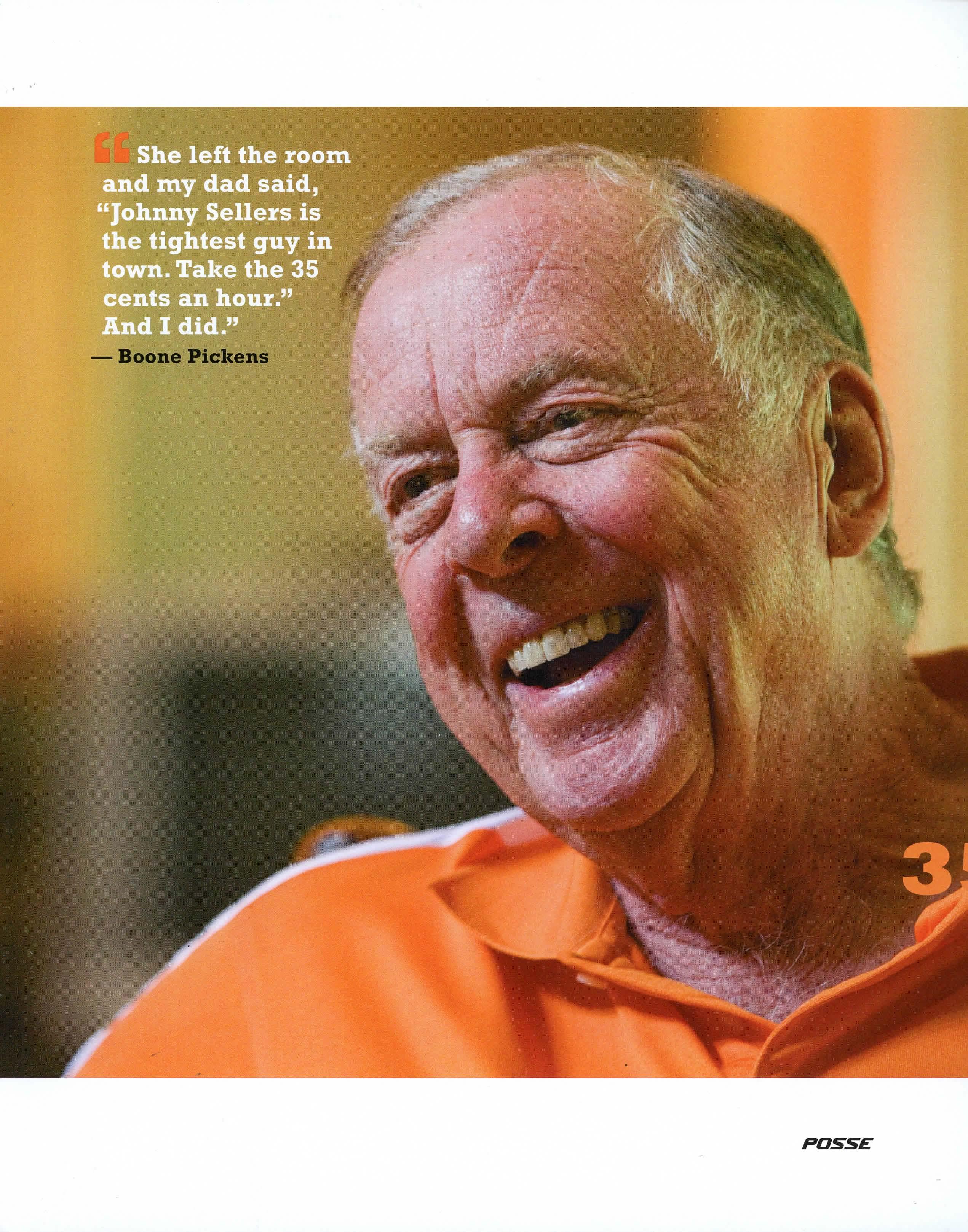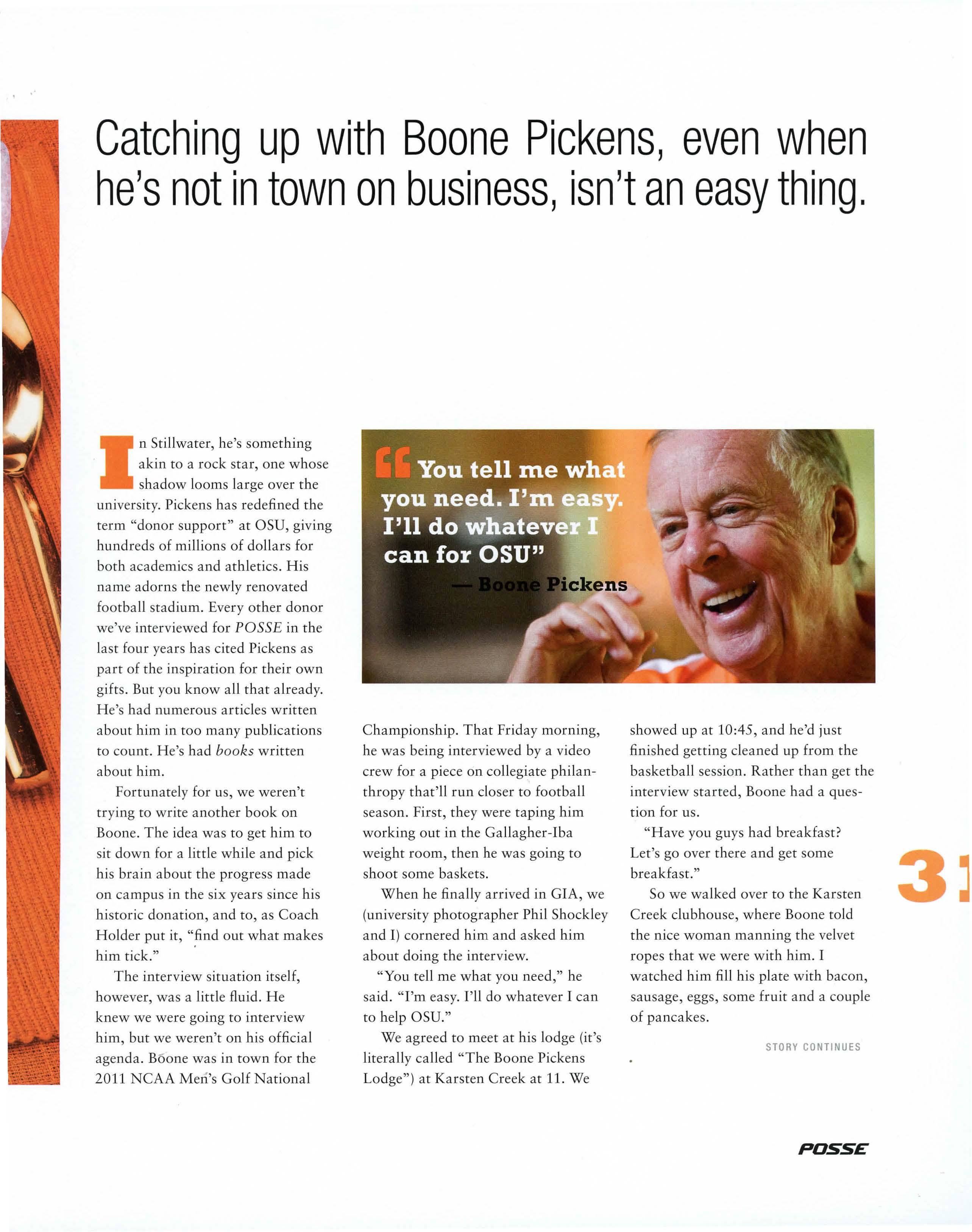 In Stillwater, he's something akin to a rock star, one whose shadow looms large over the university. Pickens has redefined the term "donor support" at OSU, giving hundreds of millions of dollars for both academics and athletics. His name adorns the newly renovated football stadium. Every other donor we've interviewed for POSSE in the last four years has cited Pickens as part of the inspiration for their own gifts. But you know all that already. He's had numerous articles written about him in too many publications to count. He's had books written about him.