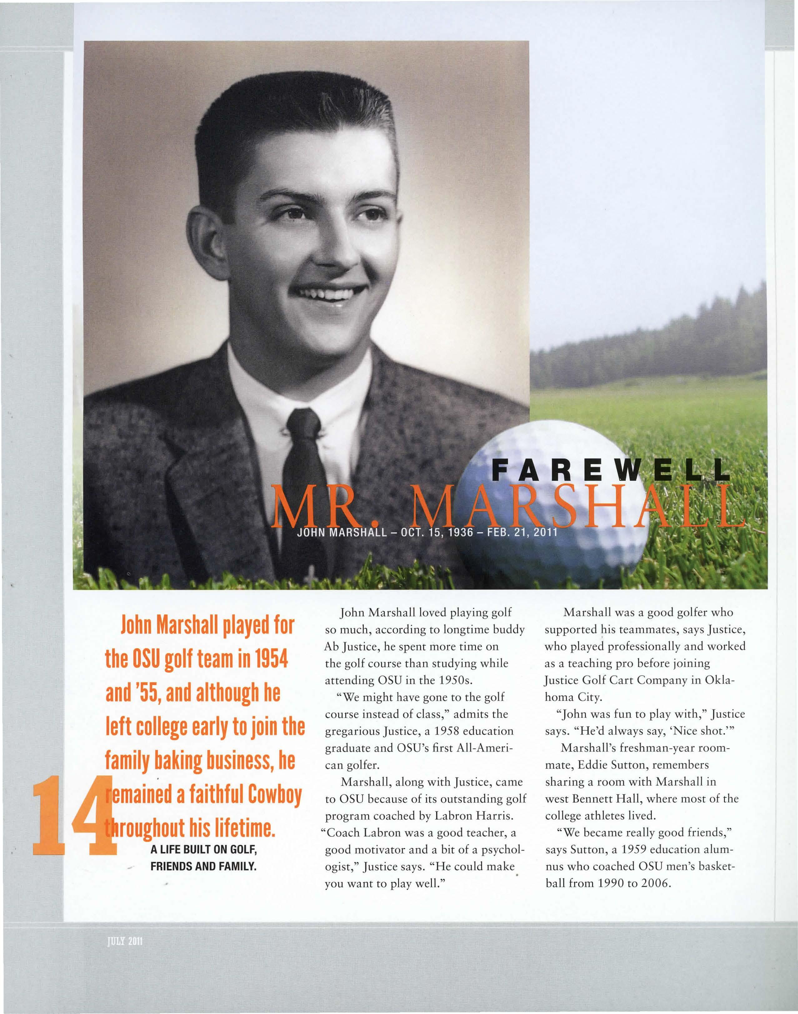 JohnMarshallplayed for theOSUgolfteamin1954 and'55,andalthough he leftcollegeearlytojointhe familybakingbusiness, he emainedafaithfulCowboy roughouthislifetime. A LIFEBUILTONGOLF, FRIENDSANDFAMILY.