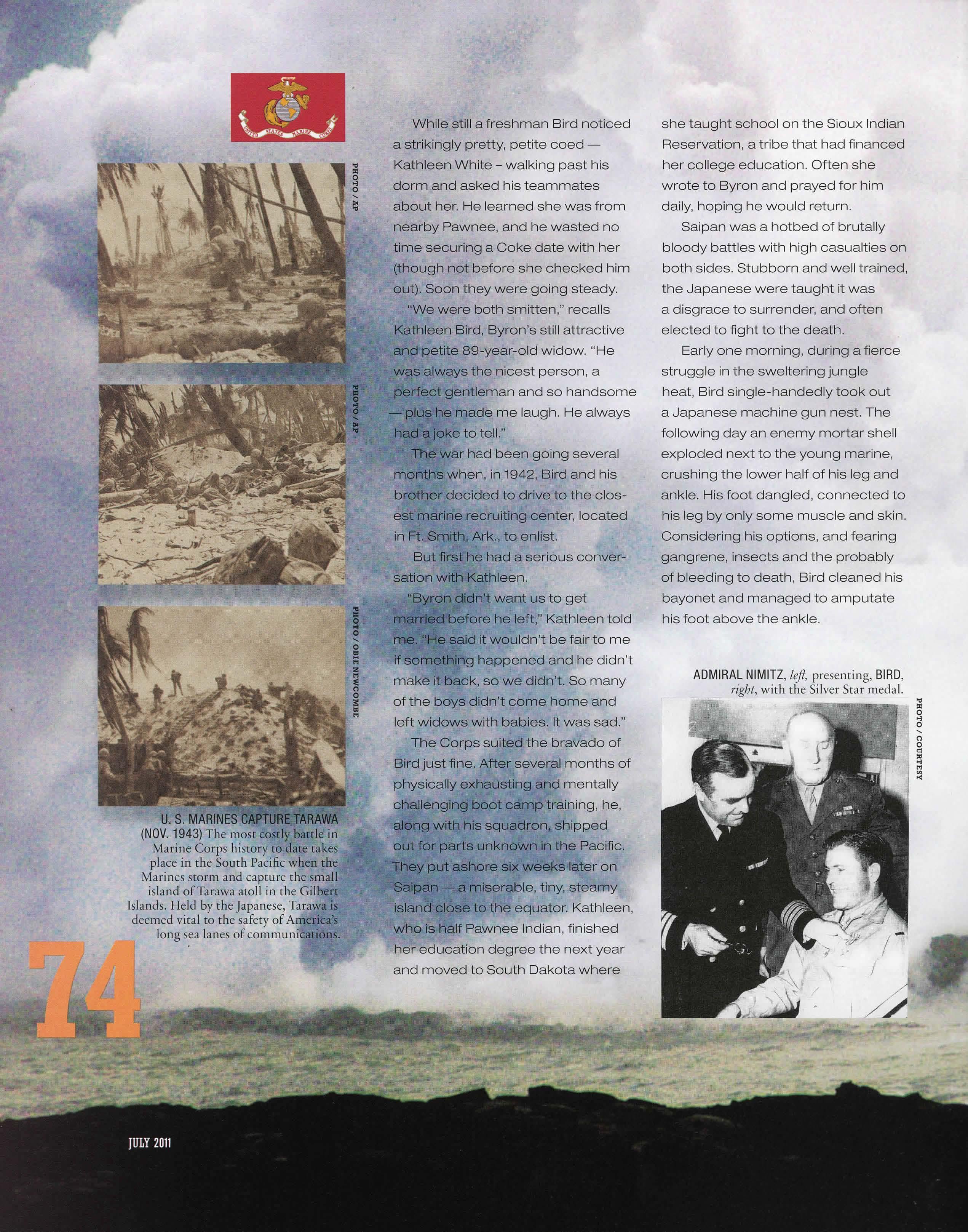 Early one morning, during a fierce struggle in the sweltering jungle heat, Bird single-handedly took out a Japanese machine gun nest. The following day an enemy mortar shell exploded next to the young marine, crushing the lower half of his leg and ankle. His foot dangled, connected to his leg by only some muscle and skin.