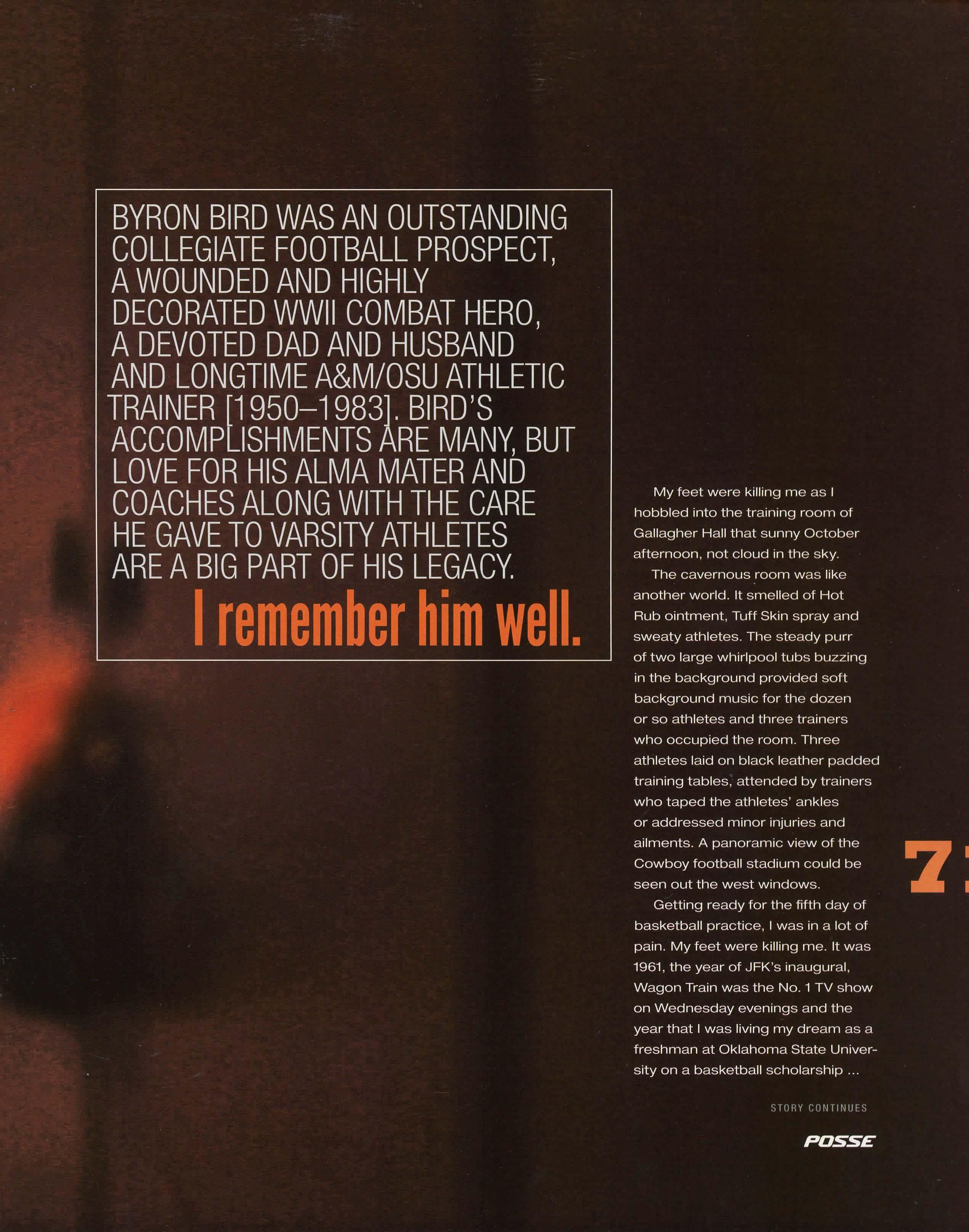 I speak for a multitude of former Aggie/Cowboy athletes who considered Bird both friend and mentor. He was a man who genuinely cared about us and, though he never resisted the urge to chastise us for our own good, would give us a much needed word of encouragement or, if need be, ask us what's wrong all while taking care of our physical ailments in a skillful and professional manner.