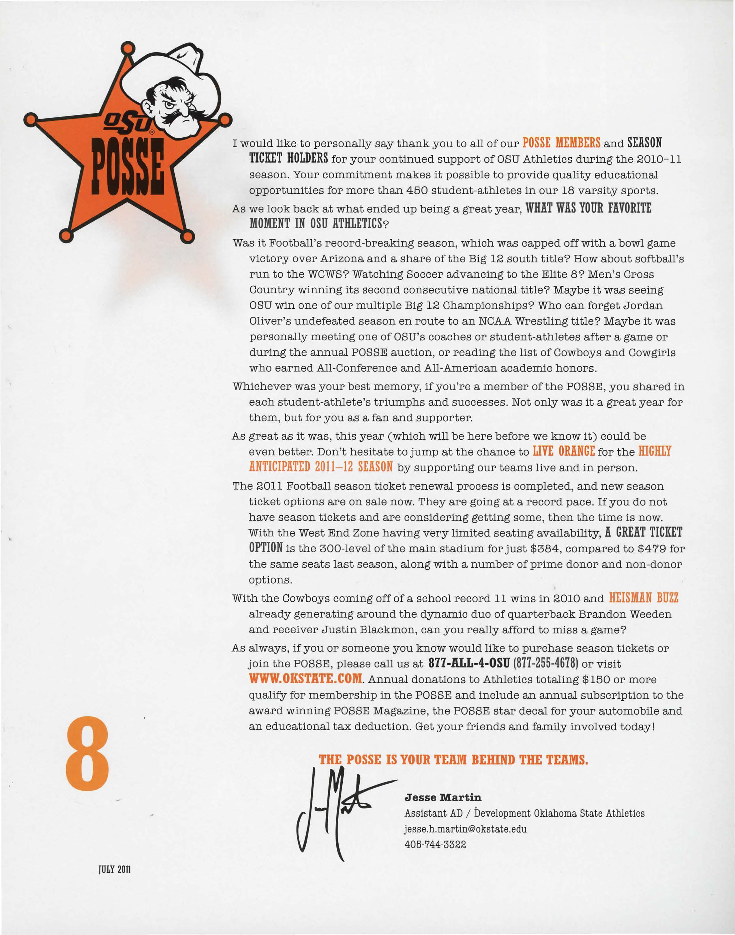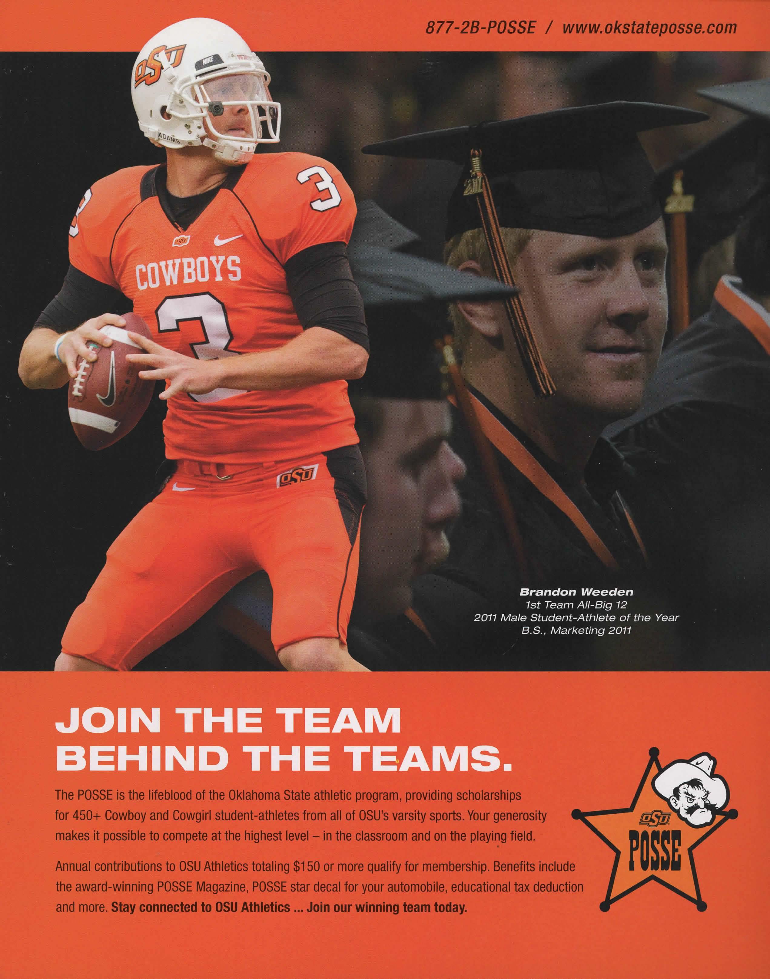 As always, if you or someone you know would like to purchase season tickets or join the POSSE, please call us at 877-ALL-4-OSU(877-255-4678) or visit WWW.OKSTATE.COM. Annual donations to Athletics totaling $150 or more qualify for membership in the POSSE and include an annual subscription to the award winning POSSE Magazine, the POSSE star decal for your automobile and an educational tax deduction. Get your friends and family involved today! THEPOSSEIS