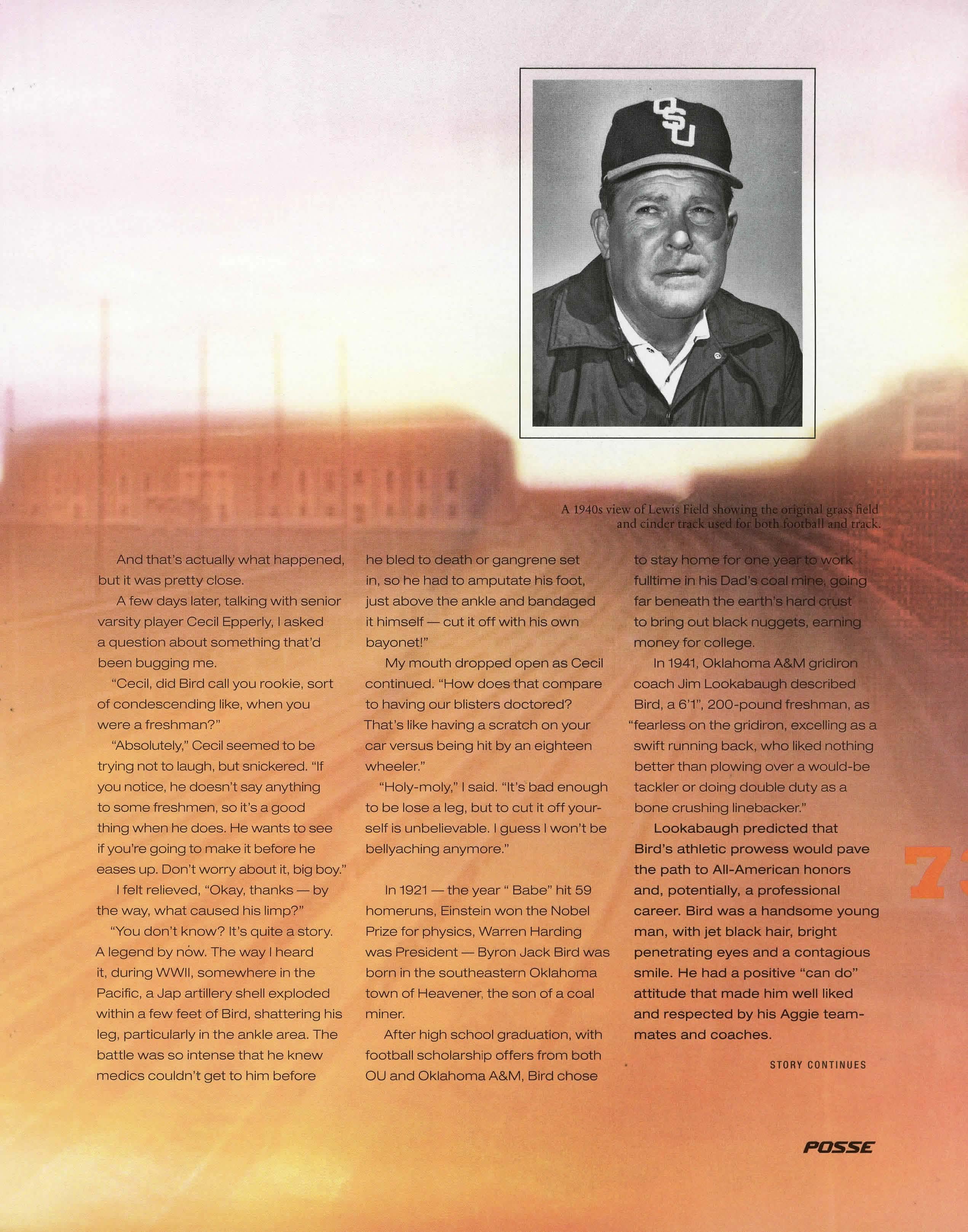 During his career Bird saw a lot of Aggie/Cowboy football as he worked with football coaches Jim Lookabaugh, "Ears" Whitworth, Cliff Speegle, Phil Cutchin, Gloyd Gass, Dave Smith, Jim Stanley and Jimmy Johnson - a real walk down memory lane for Cowboy fans.