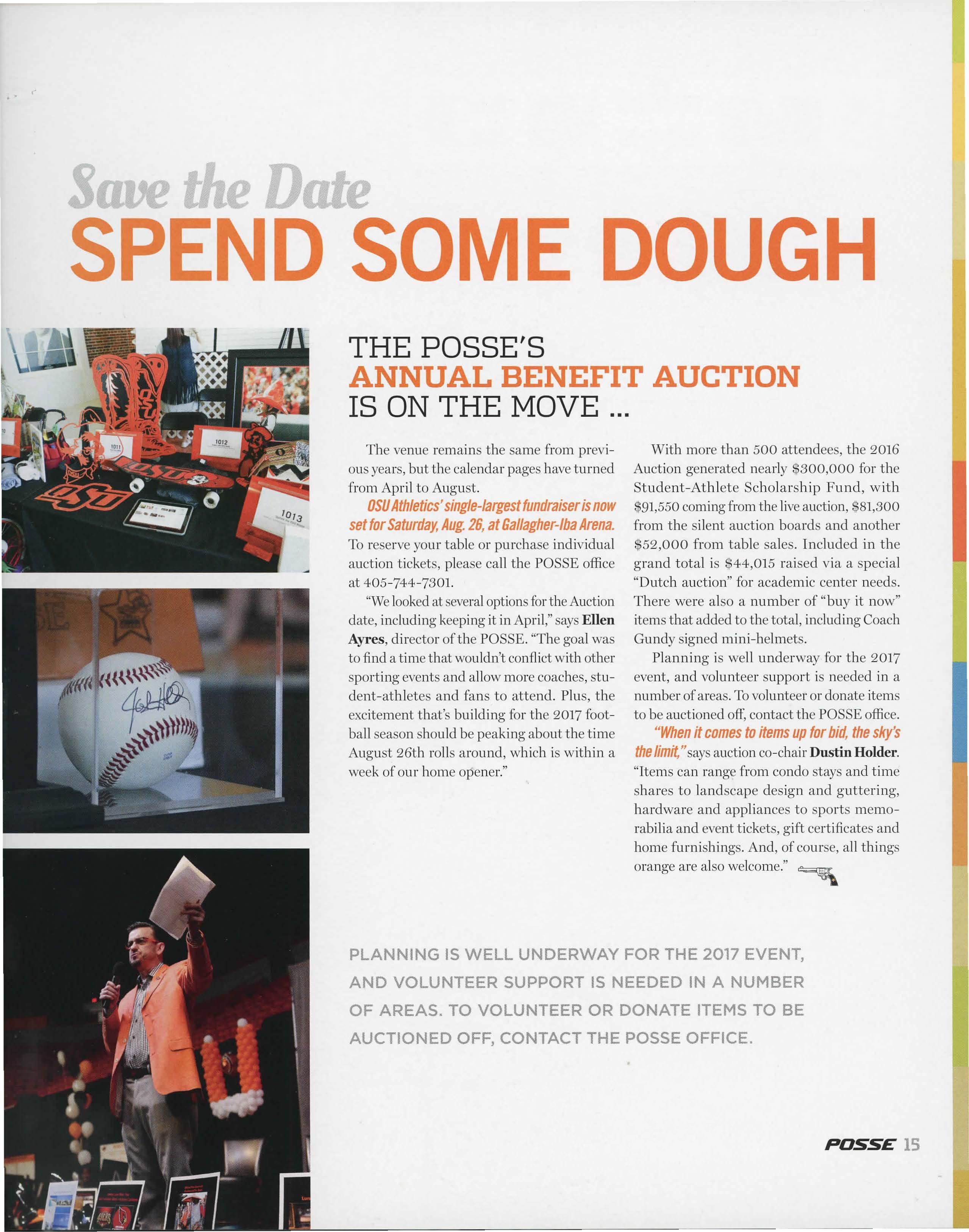 "Welooked at severaloptions for the Auction date, including keeping it in April," says Ellen Ayres, director of the POSSE. "The goal was to find a time that wouldn't conflict with other sporting events and allow more coaches, student-athletes and fans to attend. Plus, the excitement that's building for the 2017 football season should be peaking about the time August 26th rolls around, which is within a week of our home opener."
