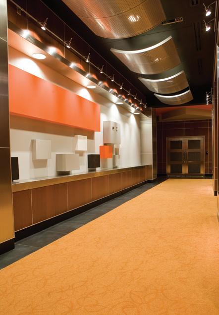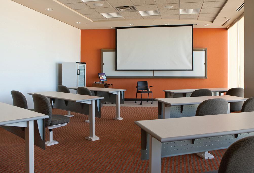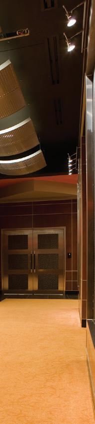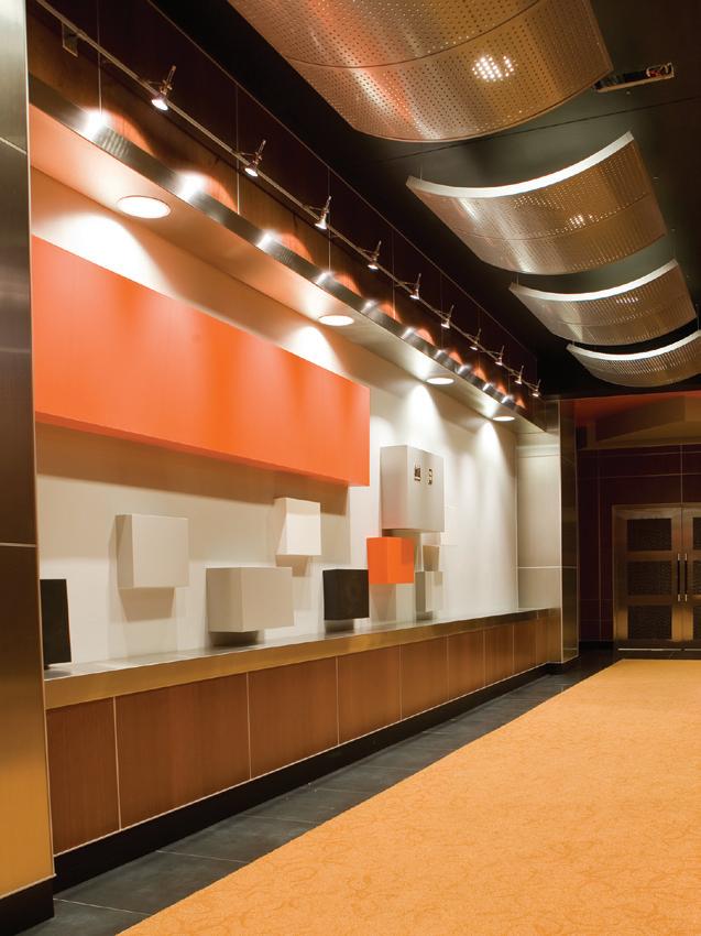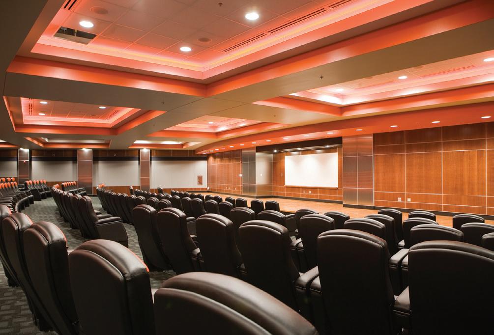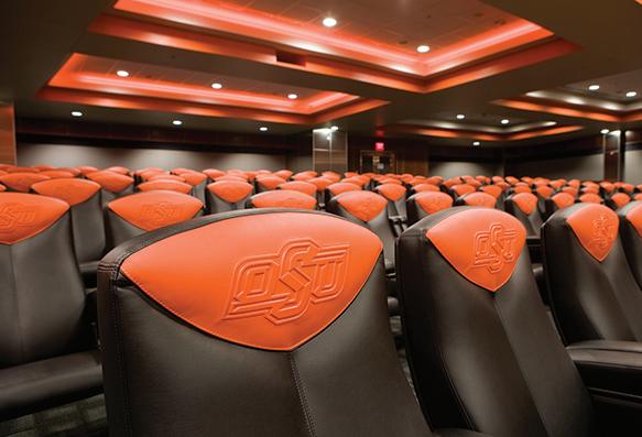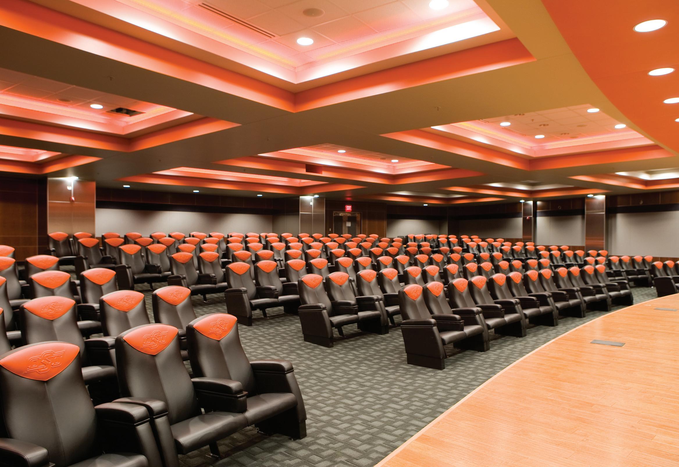 4. 199 custom built theater chairs with orange OSU logo head rest and extra wide seating surface, orange LED lighting in soffits, stainless steel doors, stainless wall panels, hardwood floor stage, custom wood panels with hidden doors to access AV equipment and storage room.