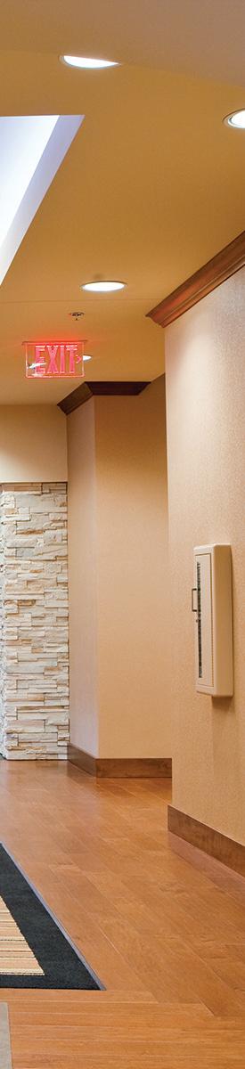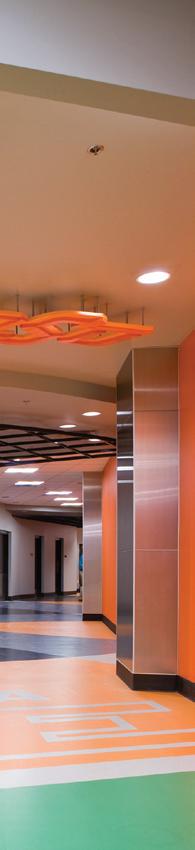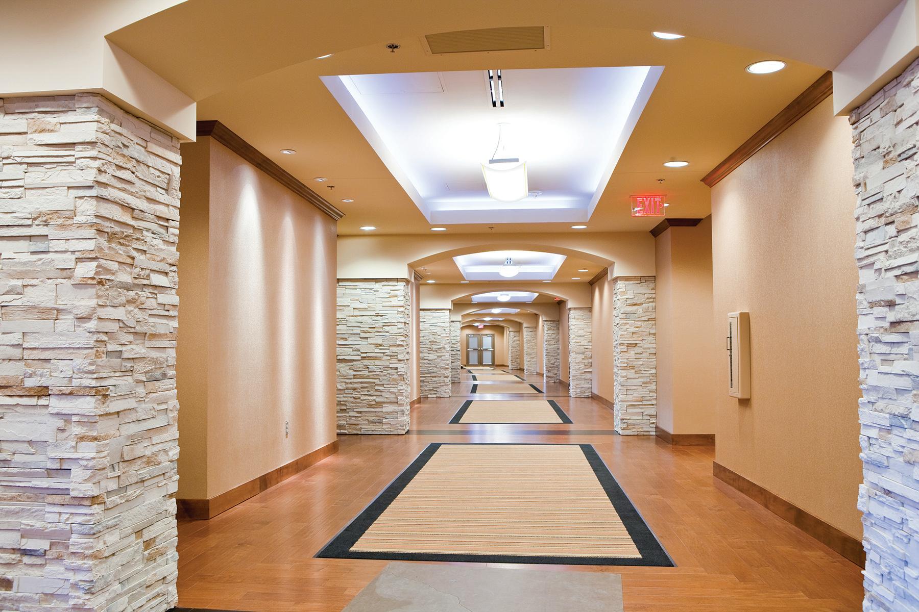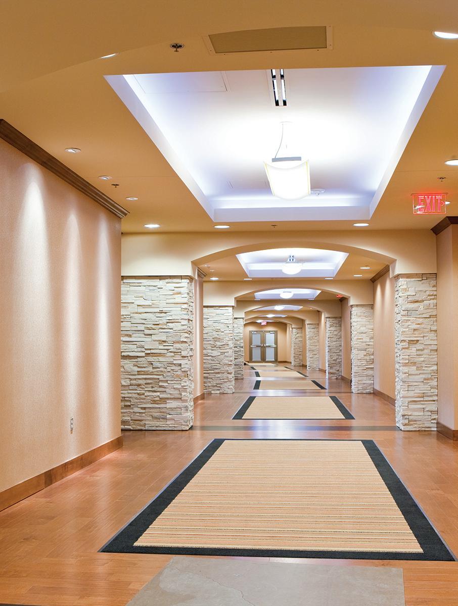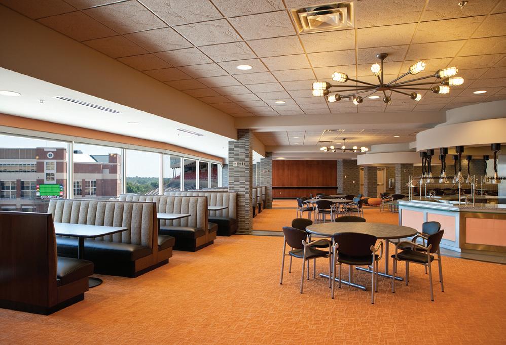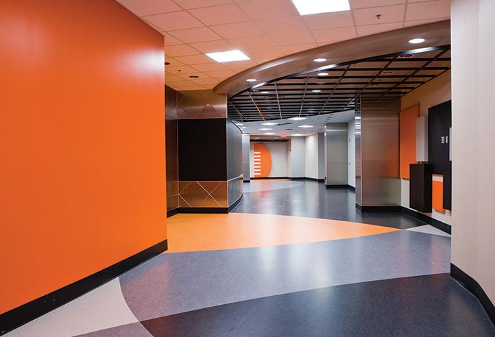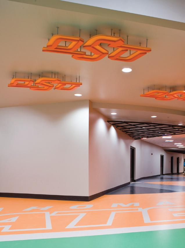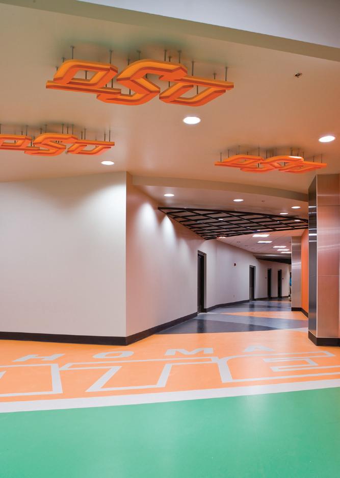 4. Field-level hallways leading to team meeting rooms feature custom flooring to mimic the playing field, along with OSU logos suspended from ceiling.