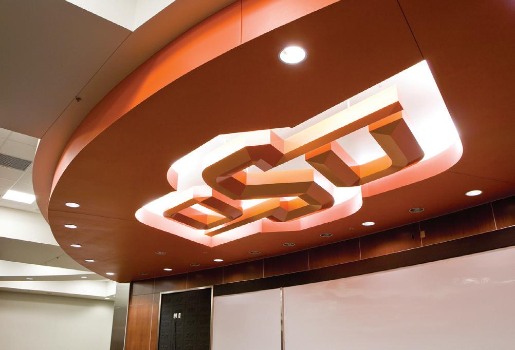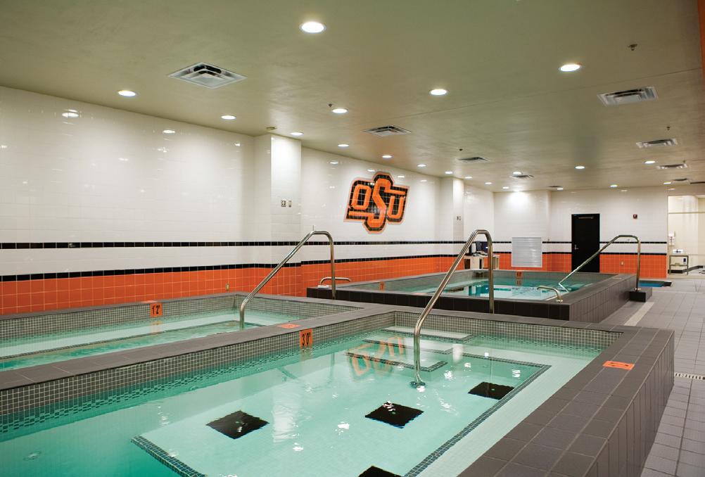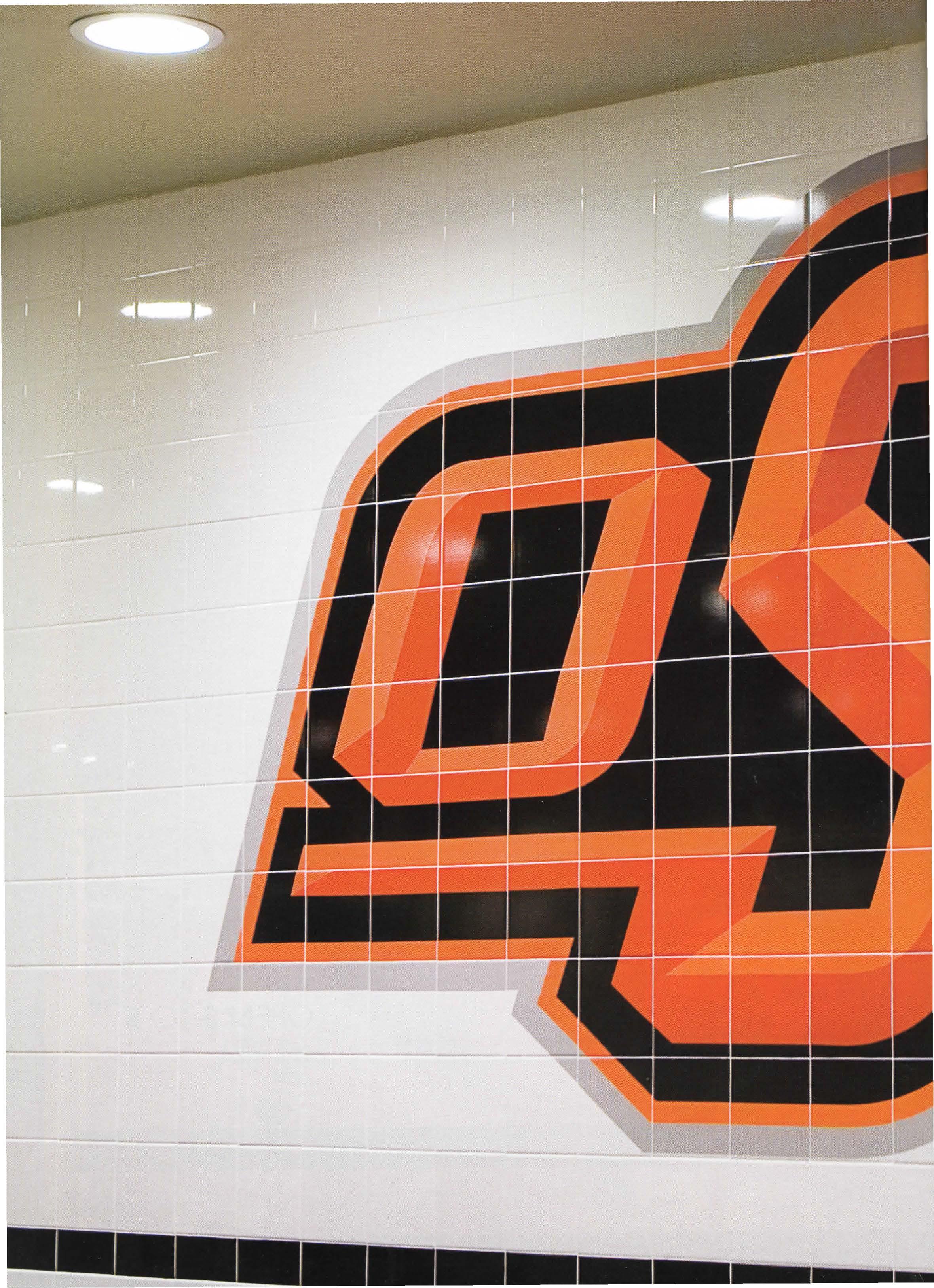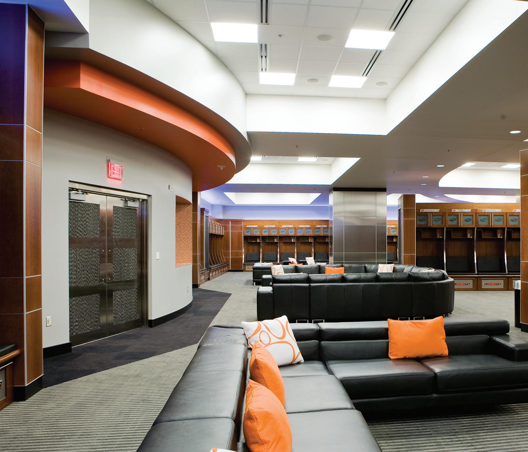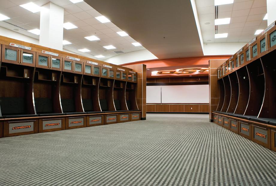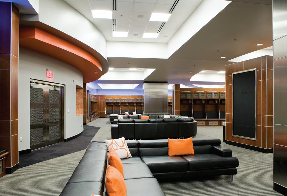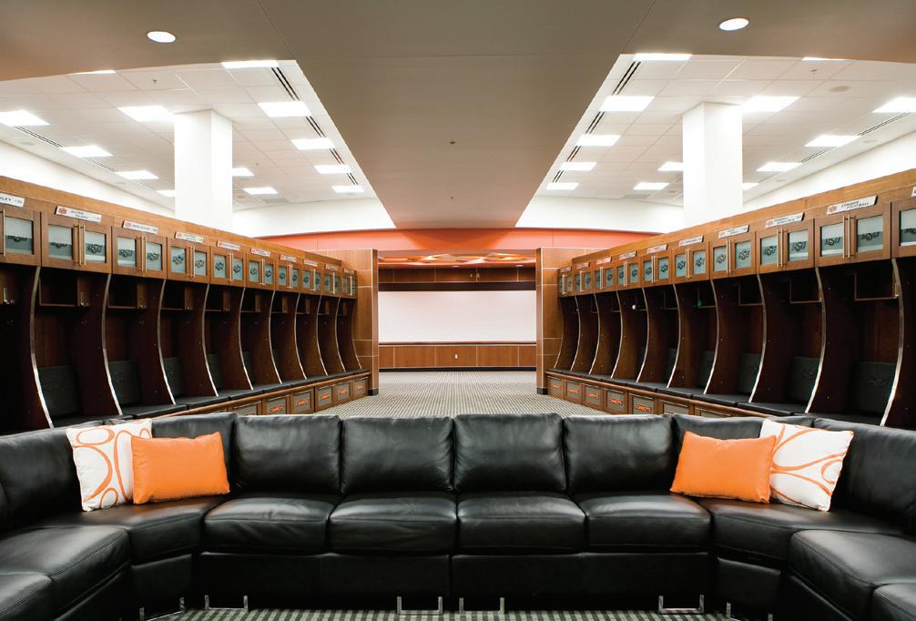1. Players' locker room features Marlite and stain less wall panels, stainless steel doors, glass tile inset for TV's, leather seating areas, OSU logo carpet and ceiling. Custom-designed lockers boast built-in ventilation system, embossed leather built in seat, electrical outlet for charging phones and iPods, plus orange LED lights behind frosted glass.