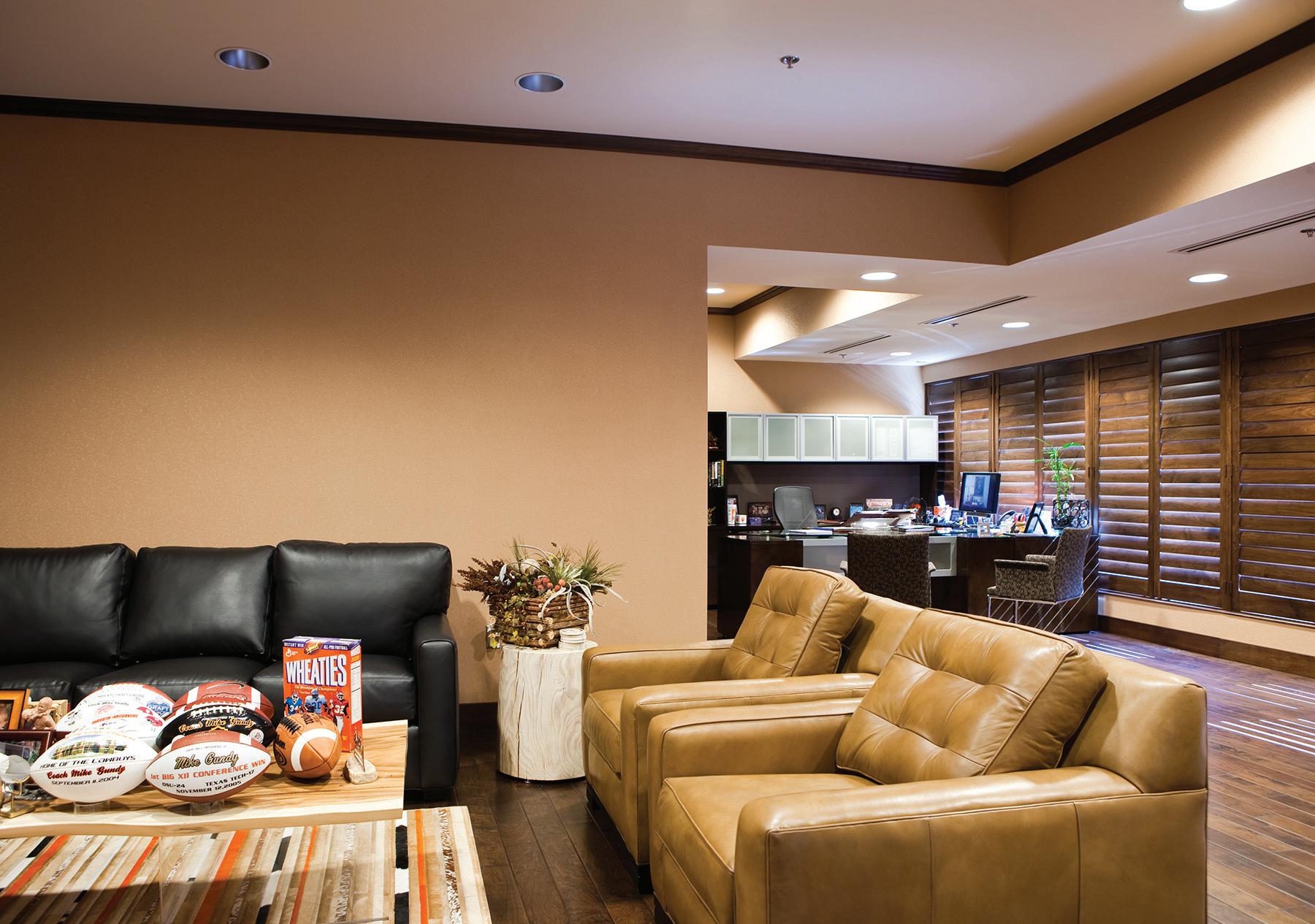 2. Locker room ceiling offers cove lighting with multiple settings. Custom coaching wall provides 65 feet of white board space along with two large TV’s.
