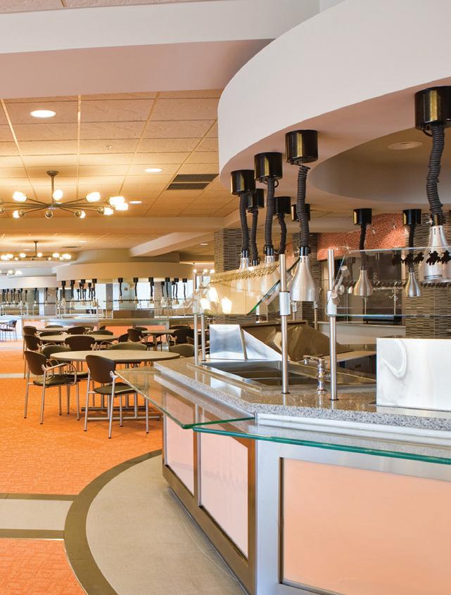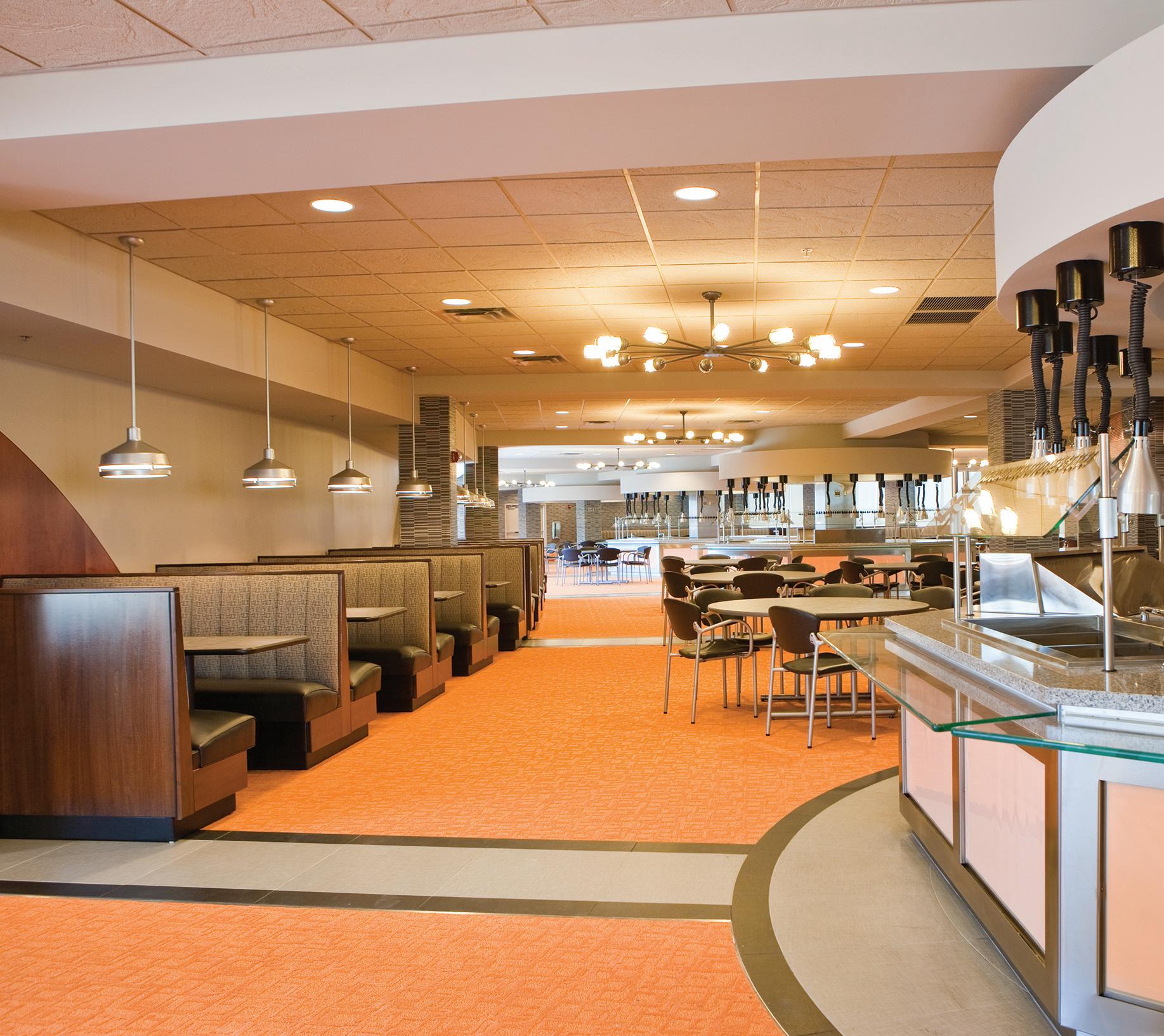 1. Marlite wood paneling, 4 custom serving kiosks with glass tray slides, OSU riders etched in glass sneeze guards and back lit graphic interchangeable panels and oversized booths.