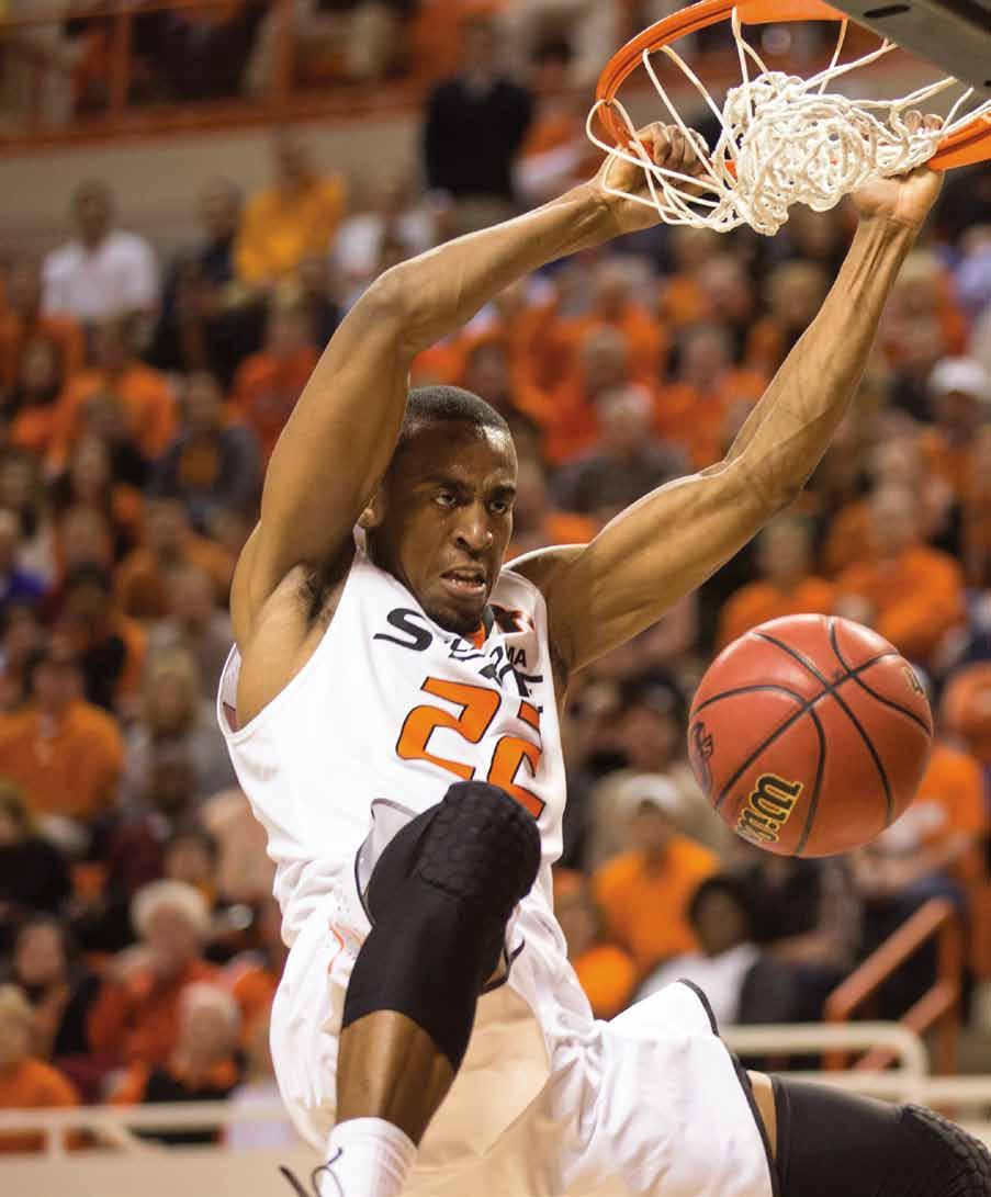 eddIe’s junIor year the cowboys pulled a major upset. the n o. 1 rated k ansas Jayhawks and Wilt Chamberlin came to Stillwater. “Wilt was the best center to ever play the game … not only huge but a splendid athlete, virtually unstoppable. Wilt had 18-20 points at the half. During halftime Mr. Iba made an adjustment. He told us guards to slow Wilt down, bump him as he crossed half court so he couldn’t get the ball on the low block. It worked. We forced Wilt to catch the ball at the free throw line, and he had to work harder, but he still scored 33 points.” Eddie paused, “With the score tied, we froze the ball for the final four minutes. The plan was, when the clock got down to eight seconds, for me or m el Wright to take the last shot. Mel flashed open at the top of the key with 10 seconds remaining and hit the shot. g allagher Hall went wild.” In that longtalked-about game, Eddie scored 18 points, drilling nine of 12 tries, all from what today would be 3-point range, which made him the Cowboy’s leading scorer. t he p okes ended the season ranked 16th in the ap poll.