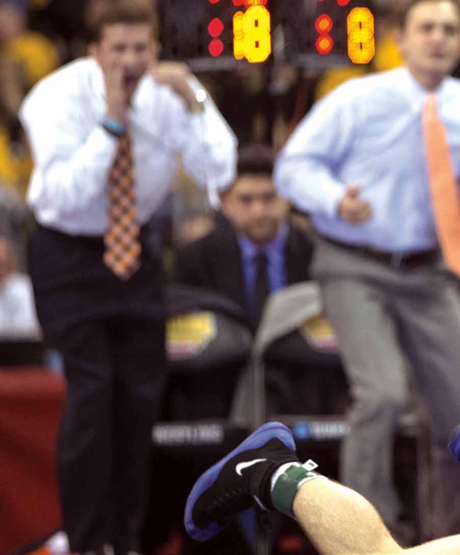 Eddi E , lower left ,relaxes during a family fishing trip to Canada. At Oklahoma State, above , during Sutton ’s junior year. d igg E r Ph E lPS, at right , confers with Arkansas basketball coach Eddi E Sut ton