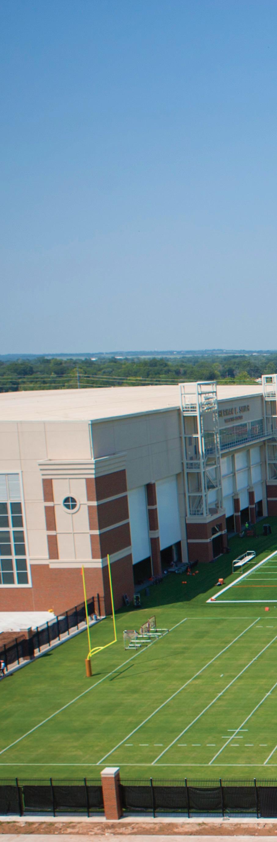 Construction began on the new practice fields in April 2011. In June 2013, the football Cowboys moved their summer workouts from the scorching turf of the stadium into the indoor center. On Aug. 8, as football’s fall camp entered its second week, the Cowboys held their first o cial team practice in the Smith Center when the threat of lightning forced them to vacate the traditional east fields on the Duck Street side of the Athletics Center. The Cowboys apparently liked the new digs because they never went back to the old ones.