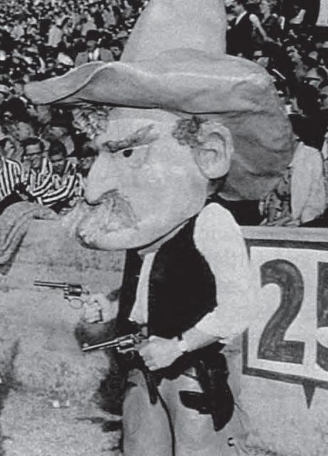 My first involvement with the original Pistol Pete was in 1956. I was visiting my brother at Oklahoma A&M and saw a crowd of students in the Student Union gathered around an old guy dressed as a cowboy, right down to his chaps and six-shooters. The man was Frank Eaton — the original Pistol Pete. Frank was the real thing, a true cowboy with two Colt 45s in his holsters and hundreds of tales of the Old West in his head. Eaton was also something of a character who had been roaming the sidelines of home football games since 1923. He even served as the model for the first Pistol Pete cartoon logo.
