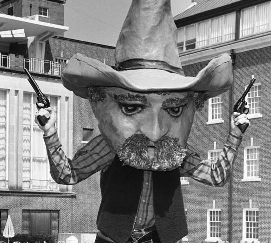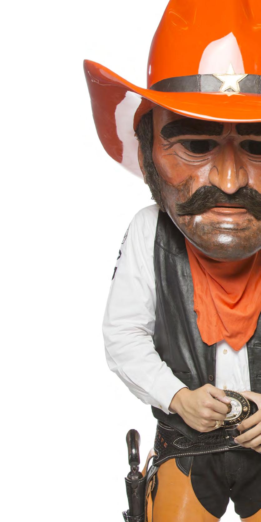 The 1958 season, when I was a freshman, was to be the first OSU football season without Frank Eaton “Pistol Pete” in more than a quarter of a century. A loose-knit group of students started meeting with the idea of honoring the original Pistol Pete by creating a replica that would be recognized by the university as the official OSU mascot. Because it was known that I had been something of a friend of Frank, I was asked by Chuck Marshall, a student representing the Spirit Club, to join their group. This mascot committee was so loose-knit, you pretty much “joined” by showing up to meetings. Charles Lester was the ringleader of the committee. Our core group was made up of Charles, Chuck, Don Yandell (an art student I knew from Ardmore High School) a couple of cheerleaders, some pom-pom girls, and anybody else who looked interested. We managed to get the orange chaps donated by a local merchant. I donated the spurs and double-set holster. In a real community effort, the guns — two Smith and Wesson .38 caliber Police Specials — were donated by none other than the Stillwater Police Department. We didn’t have a leather vest, so Don donated a fake-fur green vest he got from the art department. He said it would keep Pete warmer than a leather one anyway. Now all we needed was the head.