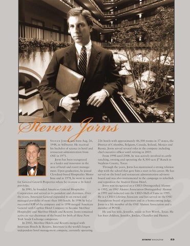 226 hotels with approximately 46,500 rooms in 37 states, the District of Columbia, Belgium, Canada, Ireland, Mexico and Russia. Jorns served several roles in the company including chief executive officer until retiring in 2005. From 1998 until 2008, he was actively involved in cattle ranching, owning and operating the 8,300-acre J7 Ranch in Stephens County, Texas. Through the years, Jorns has maintained a strong relationship with the school that gave him a start in his career. He has served on the hotel and restaurant administration advisory board and was also instrumental in the campaign to refurbish and reposition the Student Union Hotel. Jorns was recognized as a CHES Distinguished Alumni in 1992, an OSU Alumni Association Distinguished Alumni in 1993 and inducted into the CHES Hall of Fame in 1995. He is a CHES Lifetime Associate and has served on the OSU Foundation board of governors and as a homecoming judge. Jorns is a life member of the OSU Alumni Association and a member of POSSE. He and his wife, Jennifer, reside in Fort Worth, Texas. He has four children, Jennifer, Jordan, Chandler and Hunter.