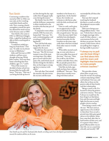 members to her house on a regular basis. At the Smiths’ house, the wrestlers are welcome to ride horses, play with the kids, eat dinner and just relax. “I love to cook, and it gives me an opportunity to take care of and feed a lot of boys who are good eaters,” she says. Over the years, both Toni and John have developed a parental mentality for the wrestlers on the team, especially those who have traveled from other states to wrestle at OSU. “When John started coaching, we were only three or four years older than most of the team,” Toni says. “Now, I’m as old as a lot of their mothers and older than a few. We are pseudo-parents for a number of boys on the team. “I feel like my kids, especially my boys, have a dream childhood,” Toni says. “They always have wrestlers wrestling with them and are
