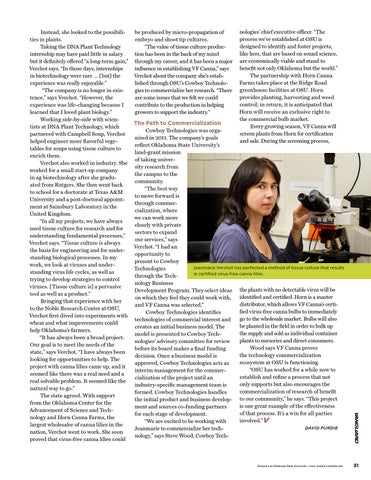The Path to Commercialization Cowboy Technologies was organized in 2011. The company’s goals reflect Oklahoma State University’s land-grant mission of taking university research from the campus to the community. “The best way to move forward is through commercialization, where we can work more closely with private sectors to expand our services,” says Verchot. “I had an opportunity to present to Cowboy Jeanmarie Verchot has perfected a method of tissue culture that results Technologies in certified virus-free canna lilies. through the Technology Business Development Program. They select ideas the plants with no detectable virus will be identified and certified. Horn is a master on which they feel they could work with, distributor, which allows VF Canna’s certiand VF Canna was selected.” fied virus-free canna bulbs to immediately Cowboy Technologies identifies go to the wholesale market. Bulbs will also technologies of commercial interest and be planted in the field in order to bulk up creates an initial business model. The the supply and sold as individual container model is presented to Cowboy Techplants to nurseries and direct consumers. nologies’ advisory committee for review Wood says VF Canna proves before its board makes a final funding the technology commercialization decision. Once a business model is ecosystem at OSU is functioning. approved, Cowboy Technologies acts as “OSU has worked for a while now to interim management for the commerestablish and refine a process that not cialization of the project until an only supports but also encourages the industry-specific management team is commercialization of research of benefit formed. Cowboy Technologies handles the initial product and business develop- to our community,” he says. “This project is one great example of the effectiveness ment and sources co-funding partners of that process. It’s a win for all parties for each stage of development. involved.” “We are excited to be working with David Purdie Jeanmarie to commercialize her technology,” says Steve Wood, Cowboy Tech-