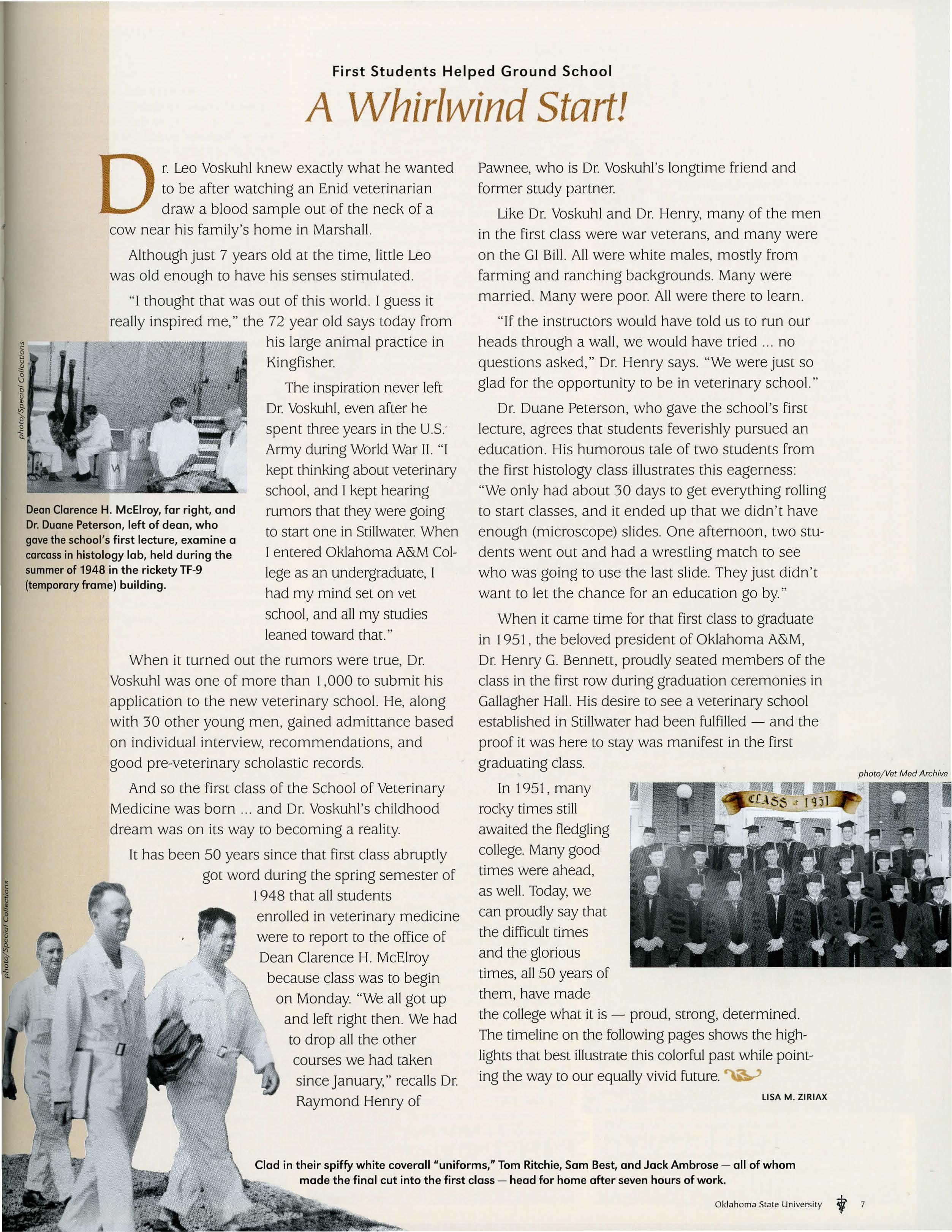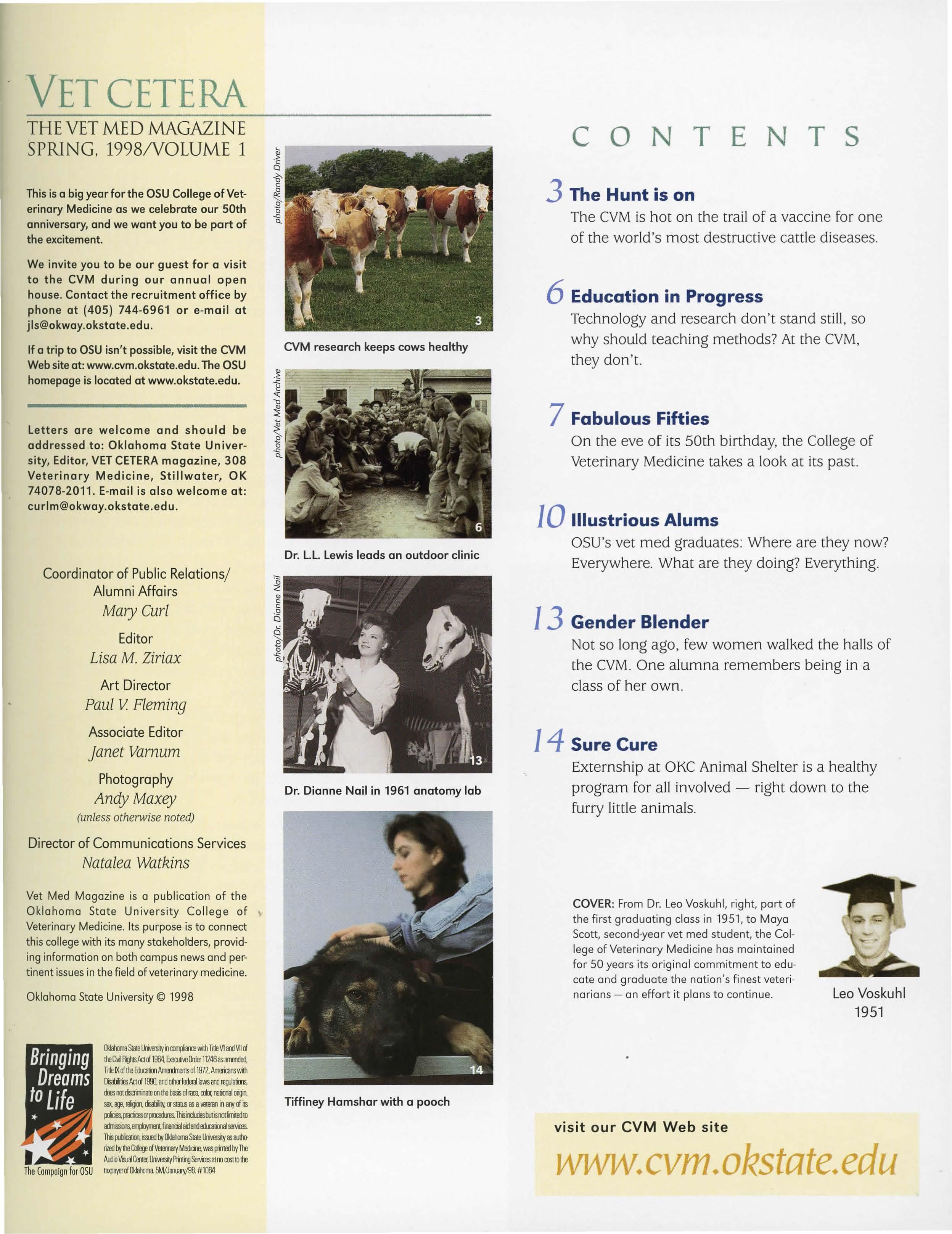 COVER: From Dr. Leo Voskuhl, right, part of the first graduating class in 1951, to Maya Scott, second-year vet med student, the College of Veterinary Medicine has maintained for 50 years its original commitment to educate and graduate the nation's finest veterinarians - an effort it plans to continue.